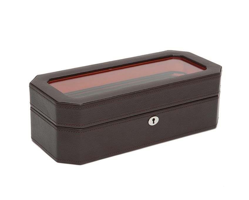 Retro shapes and colors make Windsor a perfect companion for your timepieces. Display and organize your collection beautifully with the Windsor 5-piece watch box. Features chrome finished hardware, locking glass cover, smooth vegan leather, lining and 5-piece watch storage.
