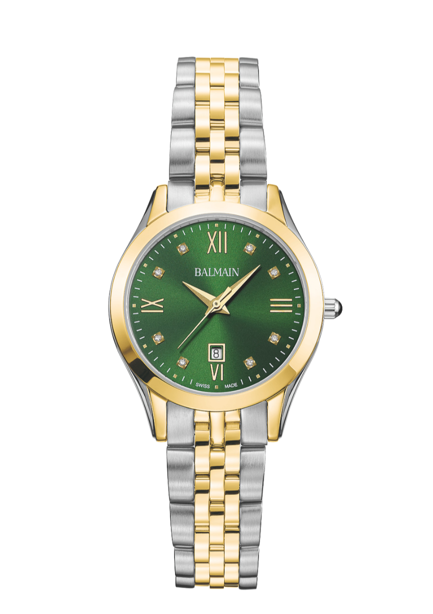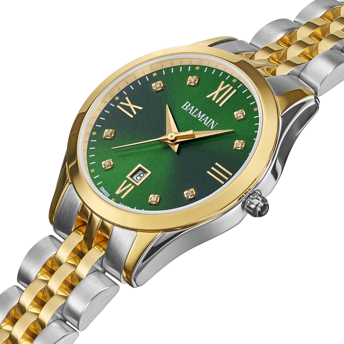 The Balmain Classic R is a refined women’s watch that blends radiant style with a modern design inspired by Parisian Haute Couture. Its deep green dial, set with 8 Top Wesselton VS-SI diamonds totaling 0.030 carats and classical Roman numerals add a feminine, graceful touch. The 30 mm bicolor stainless steel and yellow gold PVD case with a sleek 6.50 mm profile offers everyday sophistication. This Swiss Made timepiece features a sapphire crystal glass.