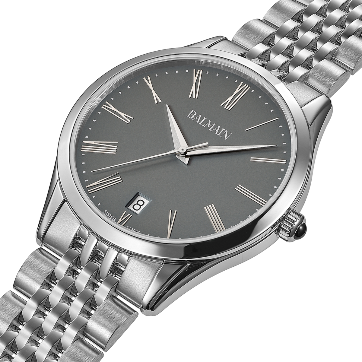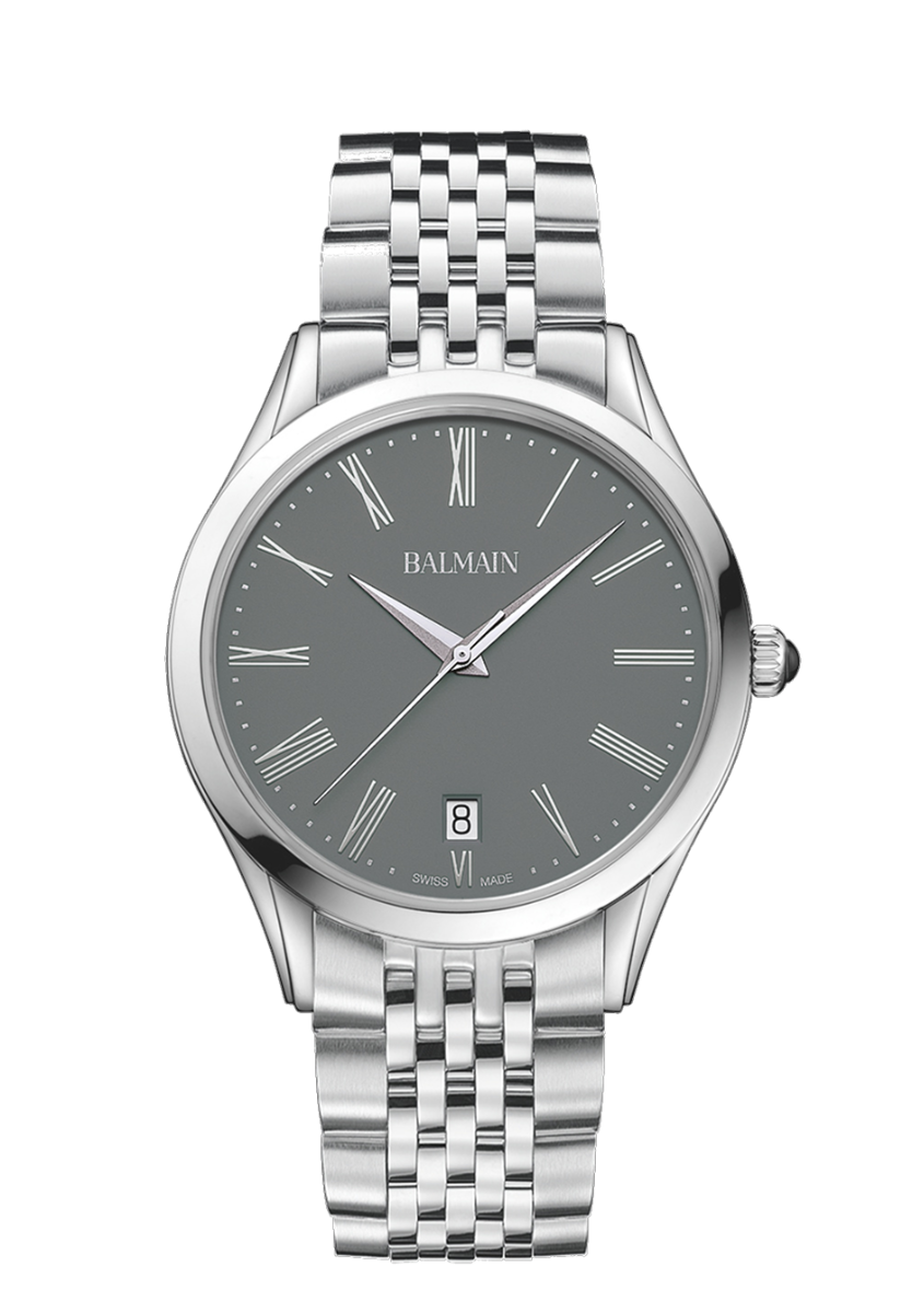 The Balmain Classic R is an artistic men’s watch that blends luminous style with a modern design inspired by the creativity of Parisian Haute Couture. Its medimum grey dial and modern Roman numerals add a vibrant, refined touch, while the 41 mm stainless steel case with a slim 7.17 mm profile and matching bracelet offers everyday sophistication. This Swiss Made timepiece features a sapphire crystal glass.