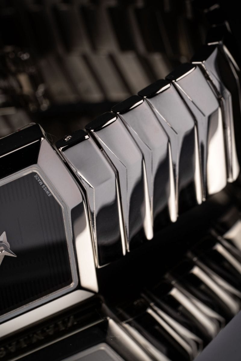 The Balmain Taffetas is a jewellery-inspired women’s watch that blends asymmetric elegance with modern charm. Its stainless steel hexagonal case and matching bracelet reflect the crisp beauty of silk, while the black dial, subtly signed with the Balmain logo, adds a refined touch. Measuring 22.50 mm, this Swiss Made timepiece features a sapphire crystal glass.