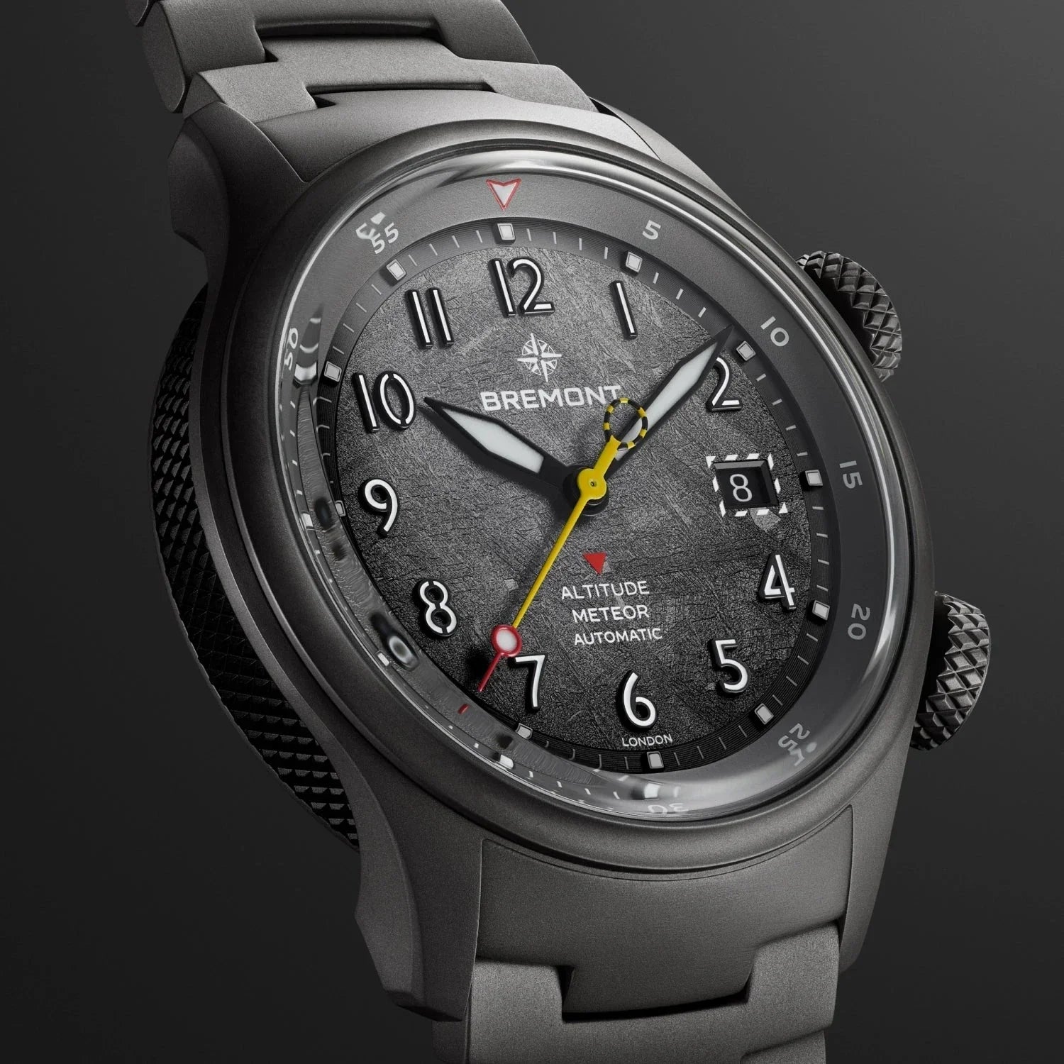 At first glance, the Altitude MB Meteor Stealth Grey keeps a low profile: a sleek, strong and sculptural silhouette in ultra-matt Grade 2 titanium. Lightweight and durable, its Stealth Grey finish is designed to absorb light and limit glare. But beneath that monochromatic surface is Bremont's MB series engineering — the trusted build behind our most advanced pilot’s watches. Built to withstand live ejection tests, its movement is protected by anti-magnetic shielding and equipped with a shock-absorbing movement mount.