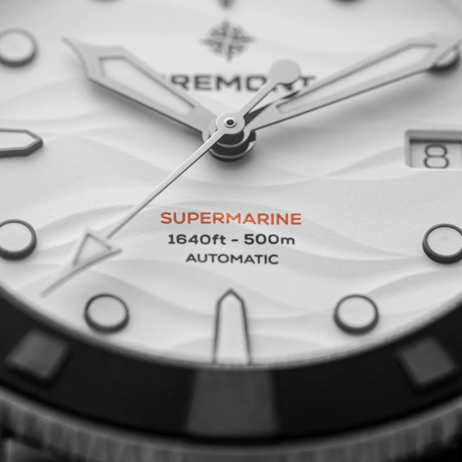 The Supermarine 500m marks a bold new chapter in Bremont’s professional dive watch collection. Crafted in 904L stainless steel, the 43mm case features a slimmer, more ergonomic profile with enhanced crown and bezel guards for added durability. Designed to withstand the pressures of deep-sea diving, it boasts a 500-metre water resistance rating, a helium escape valve, and a textured black ceramic uni-directional bezel.