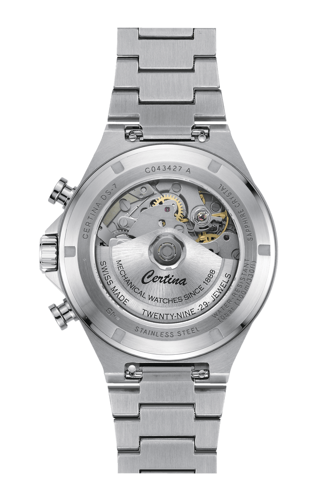 Modern, dynamic, and highly precise: The new DS-7 Chrono Auto is inspired by the popular up-and-coming sport of padel, which Certina has been involved with for years. The latest timepiece from the Swiss watchmaker celebrates this action-packed sport with a whole host of details. The striking dial features a grid structure reminiscent of the net on a padel court, and the contemporary automatic movement has an anti-magnetic silicon balance spring that is a match for even the fastest rallies.