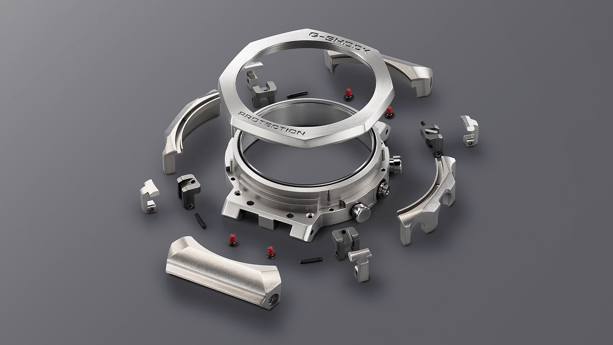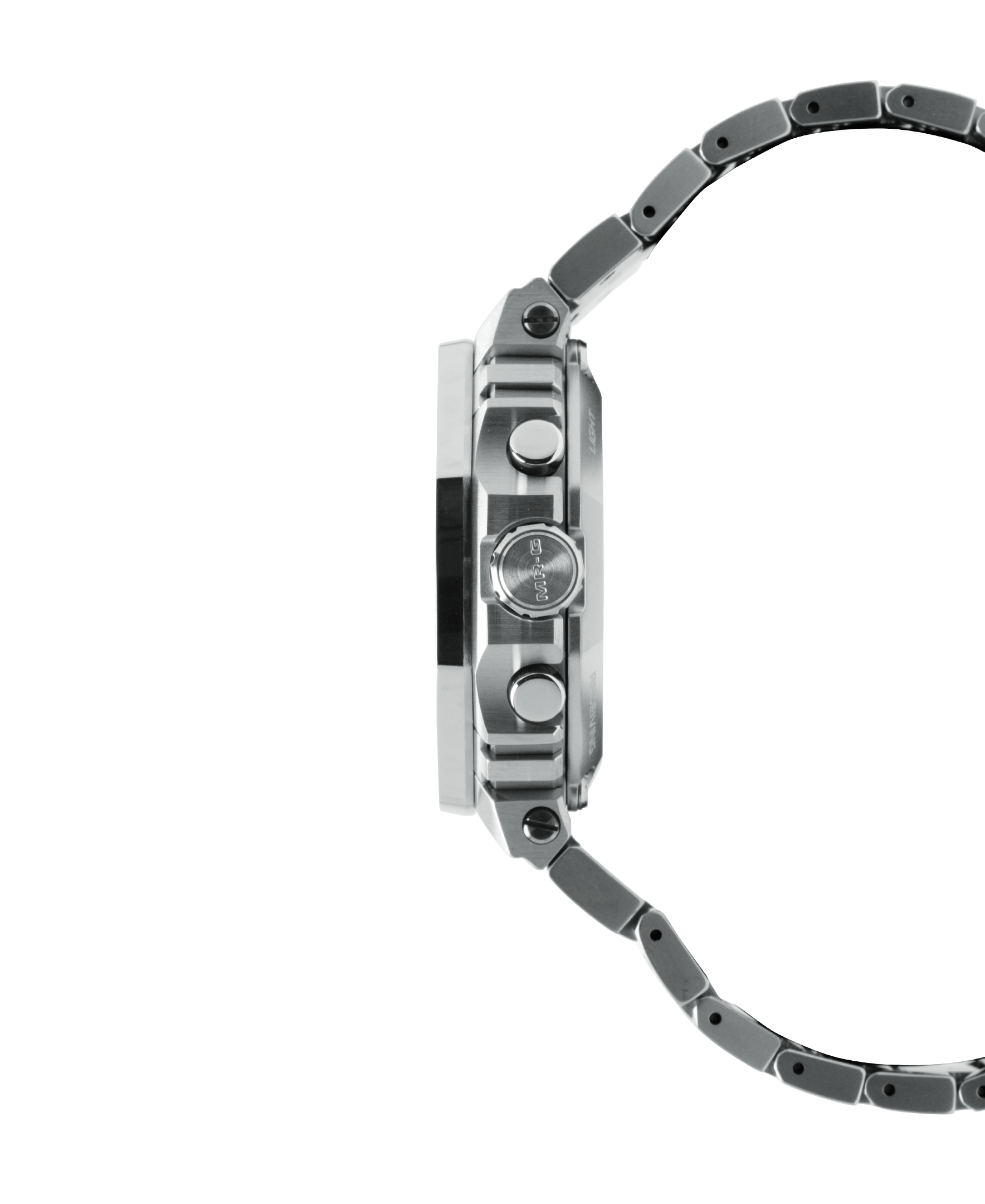 The bezel alone of this silver G-SHOCK consists of 27 different components in an intricate construction unique to G-SHOCK shock- resistant performance. Every single one is individually and meticulously polished to achieve a stunningly detailed textural appearance, ensuring that each titanium G-SHOCK MRGB2100D-1A receives special and specific attention. The state-of-the-art Multi-Guard Structure incorporates buffers between the parts to ensure outstanding shock absorption and protects the dedicated MR-G module with a gold-plated retainer plate. This level of craftsmanship grants the MRGB2100D-1A a special position among other silver G-SHOCK watches.