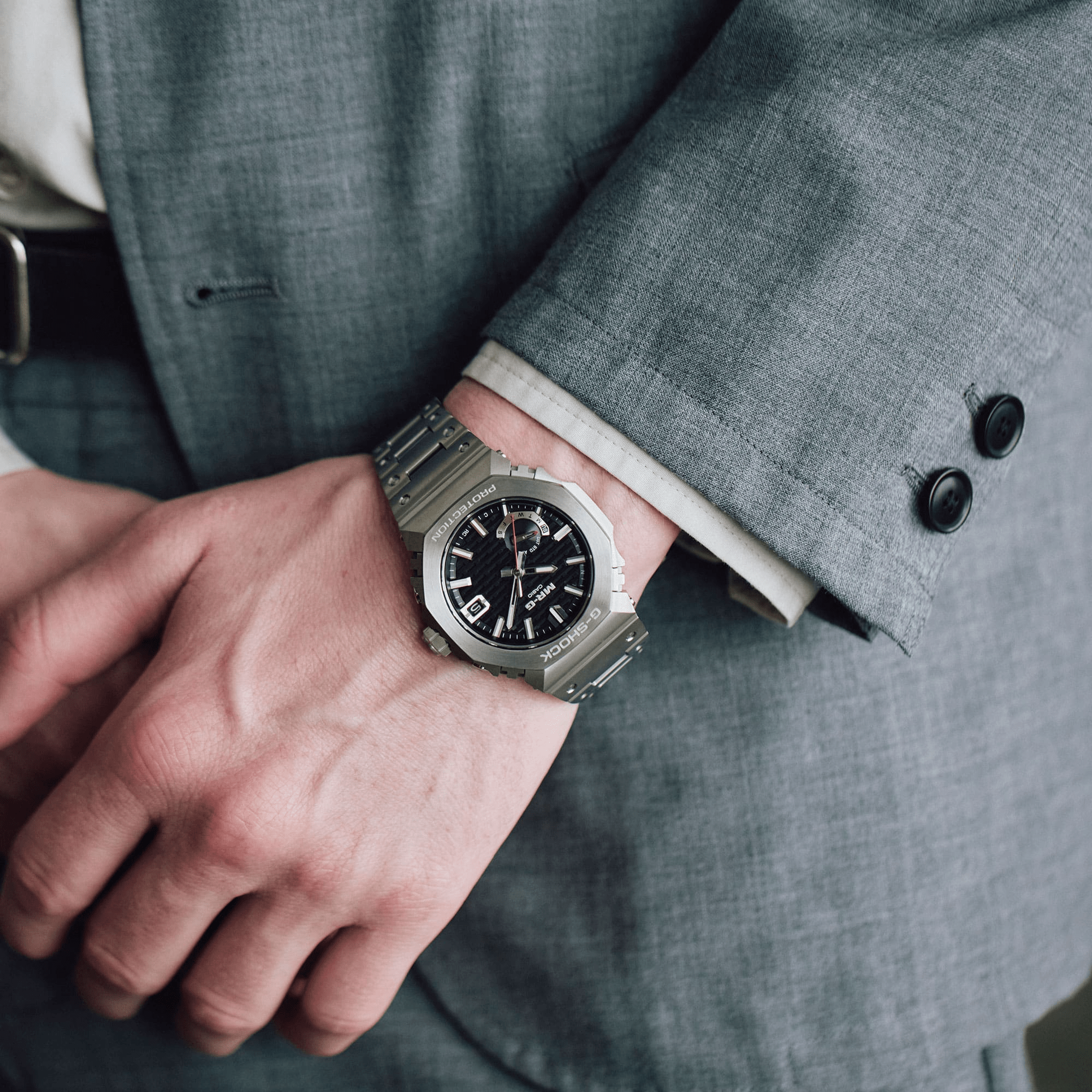 A veritable master class in metal craftsmanship, the titanium G-SHOCK MRGB2100D-1A features case and bezel components made with the hard titanium alloy, Ti64. The bezel top is fashioned from COBARION, an alloy that is four times harder than pure titanium, giving this silver G-SHOCK a brilliant gleam comparable to platinum. The band is made of another special titanium alloy, DAT55G, which is both extremely hard and highly workable. We make the most of the extra-hard metal materials to create ultra-smooth mirror finishes and apply titanium carbide (TiC) coating for even greater scratch- resistance. These intricate details further the G-SHOCK reputation for ultimate protection and imbue this luxury G-SHOCK watch with class and style all while granting you peace of mind.