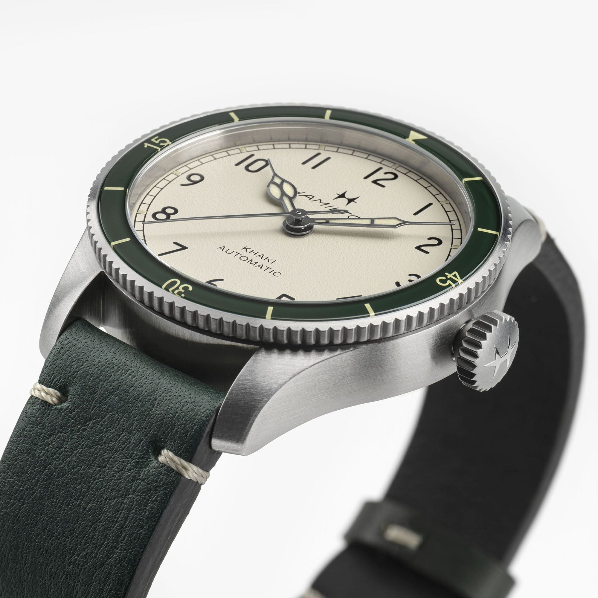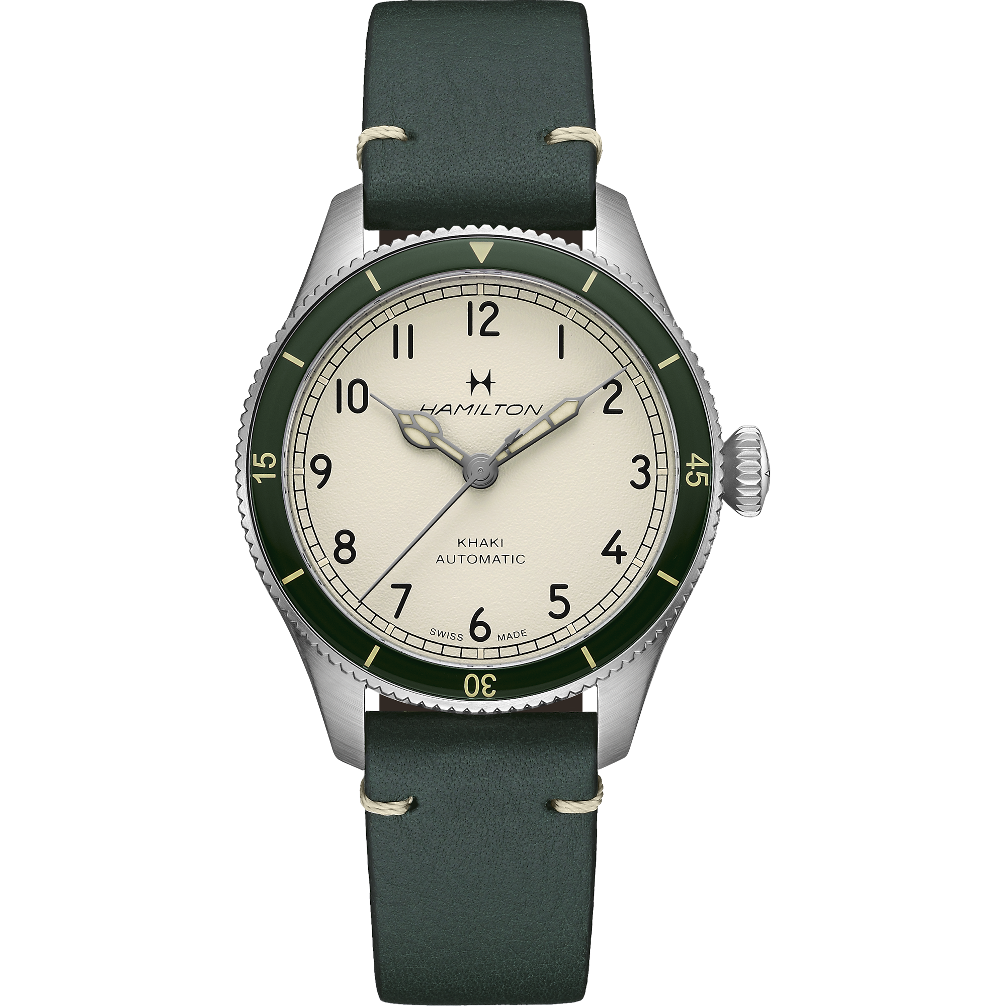 With its distinctive retro charm, the Khaki Pilot Pioneer Auto 38mm continues to honor Hamilton’s rich aviation and military heritage. Shining in moss green with a colored turning bezel, it is equipped with a H-10 movement and an 80-hour power reserve. Featuring an eggshell-white dial and green leather strap, this is a timepiece that'll never go out of style.