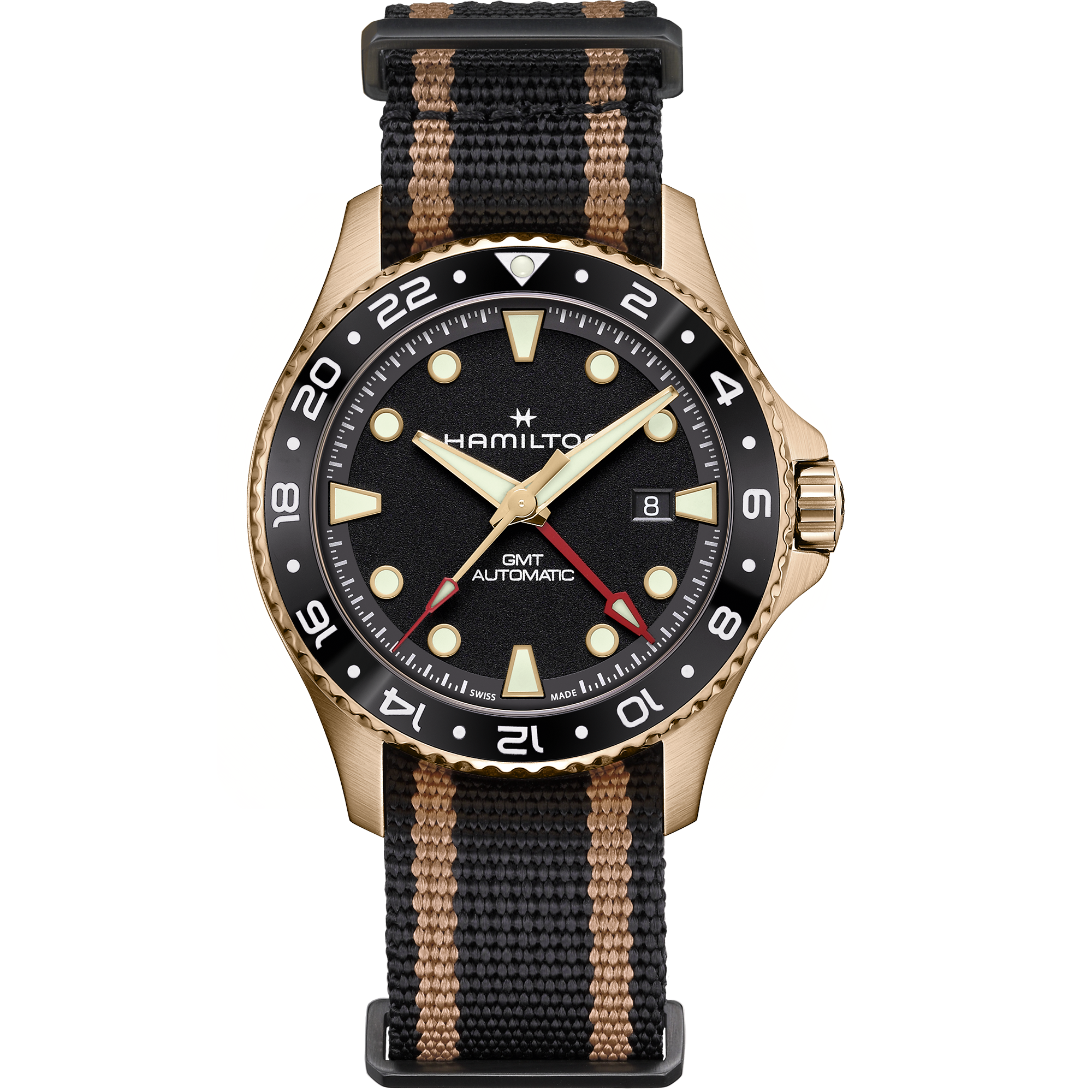 Designed for modern mariners and salty sea dogs, the Khaki Navy Automatic GMT is the ultimate traveler's watch, thanks to its precise timekeeping across multiple time zones. Boasting a bronze case with a black & gold NATO strap, the black dial is accented by light green Super-LumiNova® indexes, while a red hand indicates the GMT function and facilitates the unmissable reading of the second time zone. Featuring 30-bar water resistance, screw-down crown and a power reserve of up to 80 hours, the Khaki Navy Automatic GMT will ensure you dive into new horizons with confidence and style.