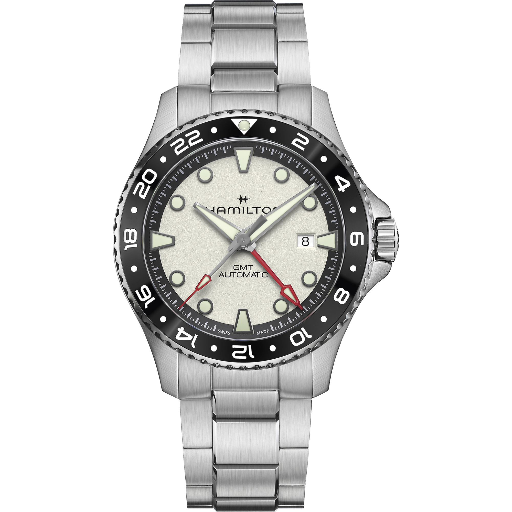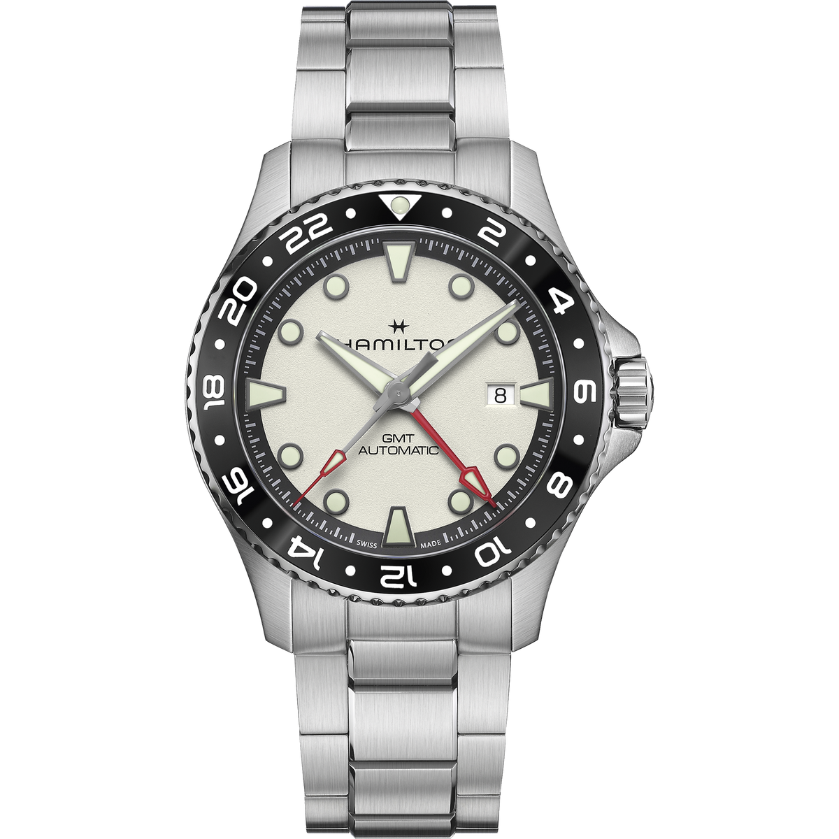 Designed for modern mariners and salty sea dogs, the Khaki Navy Automatic GMT is the ultimate traveler's watch, thanks to its precise timekeeping across multiple time zones. Boasting a stainless steel case with a brushed bracelet, the grained white dial is accented by light green Super-LumiNova® indexes, while a red hand indicates the GMT function and facilitates the unmissable reading of the second time zone. Featuring 30-bar water resistance, screw-down crown and a power reserve of up to 80 hours, the Khaki Navy Automatic GMT will ensure you dive into new horizons with confidence and style.