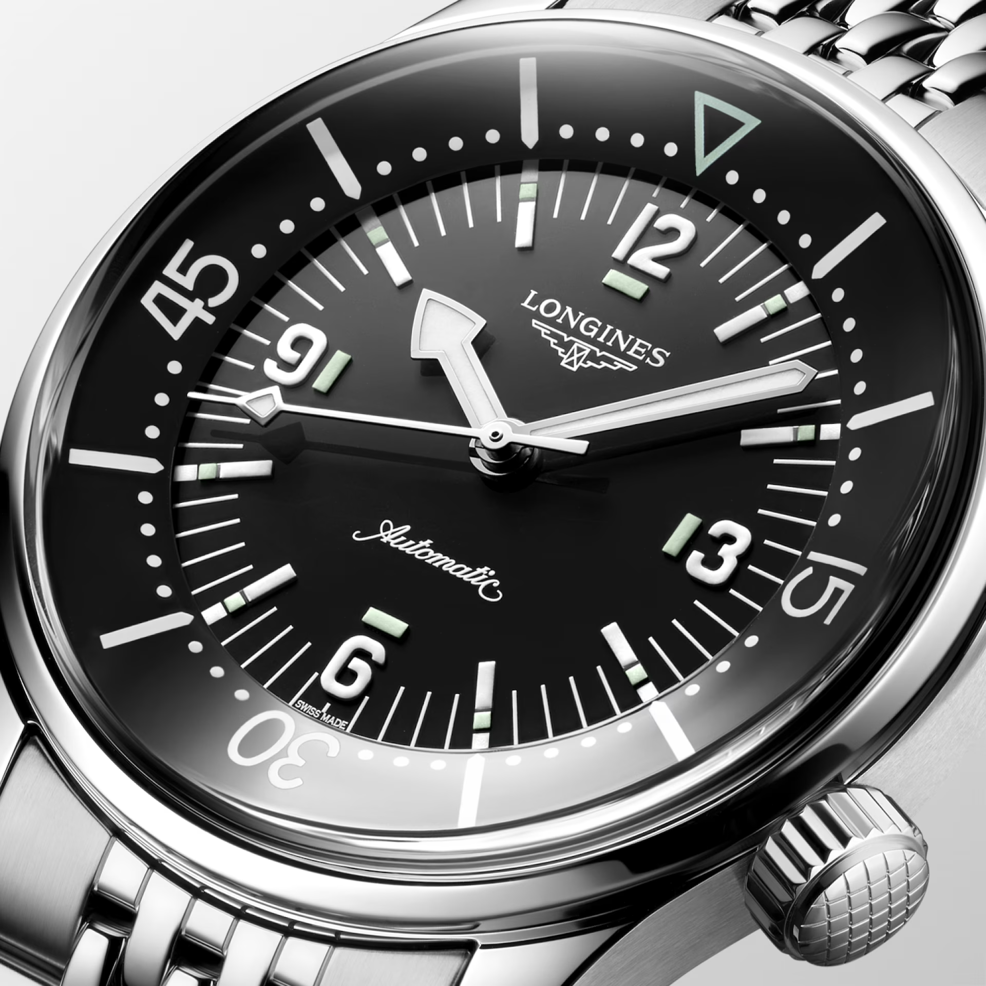 It is immediately recognisable by its two crowns and internal rotating bezel. The new LONGINES LEGEND DIVER is resurfacing with a 39 mm diameter, faithful to the original 1959 model from which it takes its inspiration.