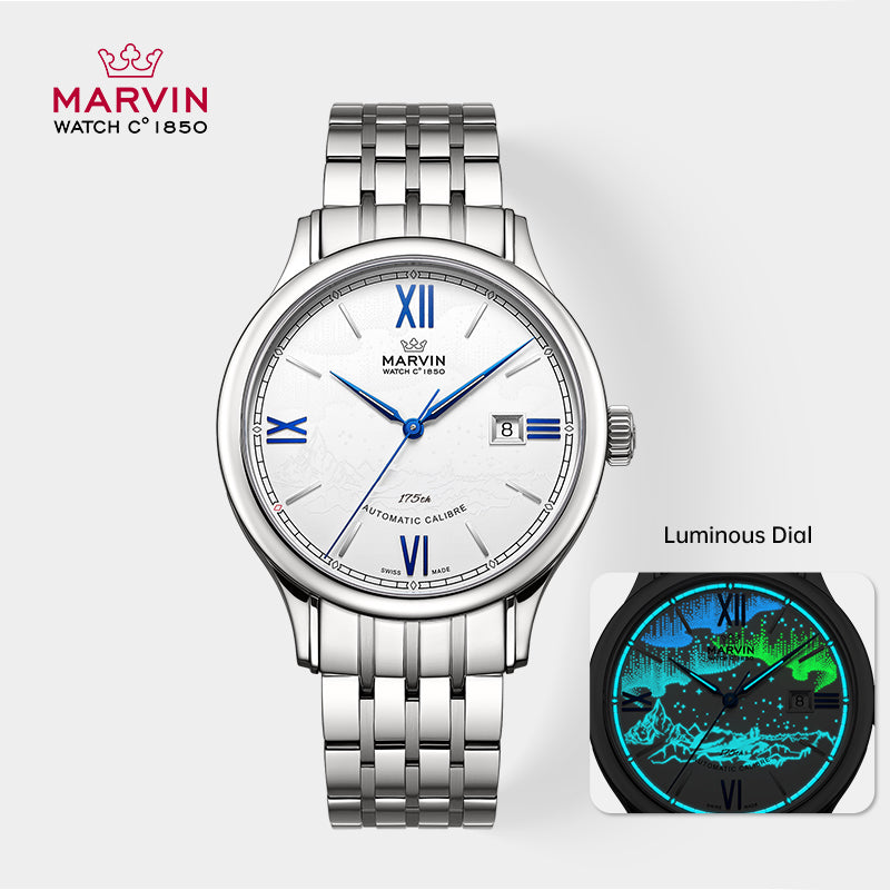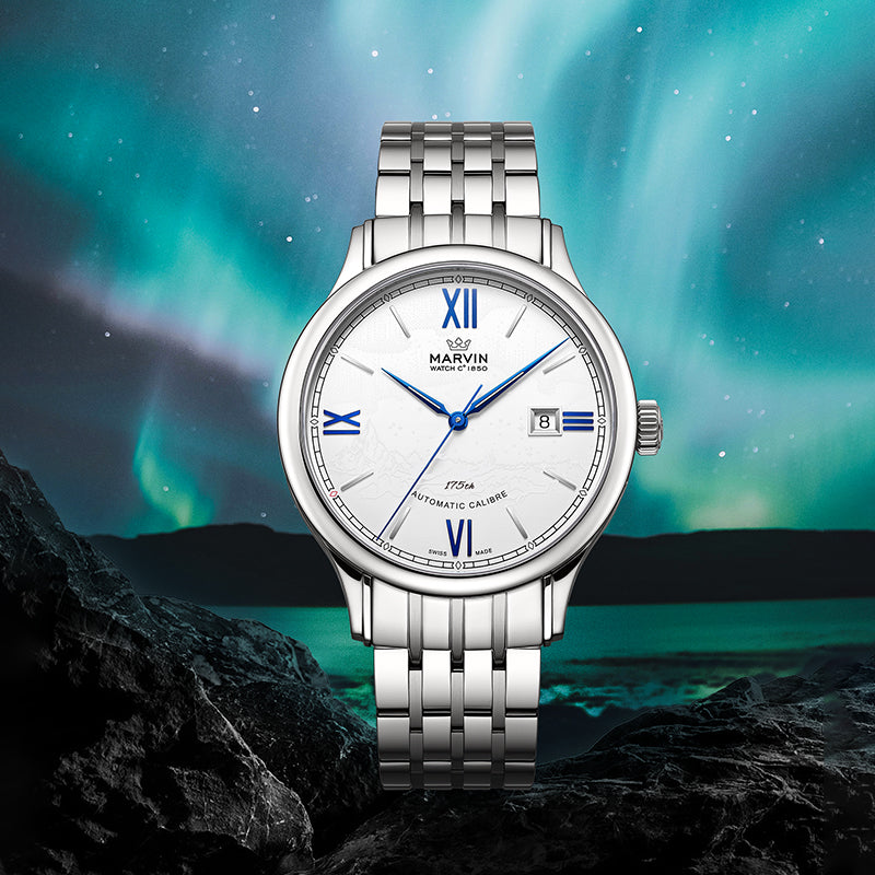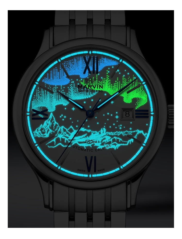 | Dial Features | Dial with Luminous Aurora Borealis Artwork (Marvin 175th Anniversary Edition) / Date Display / Luminous Hands & Markers |