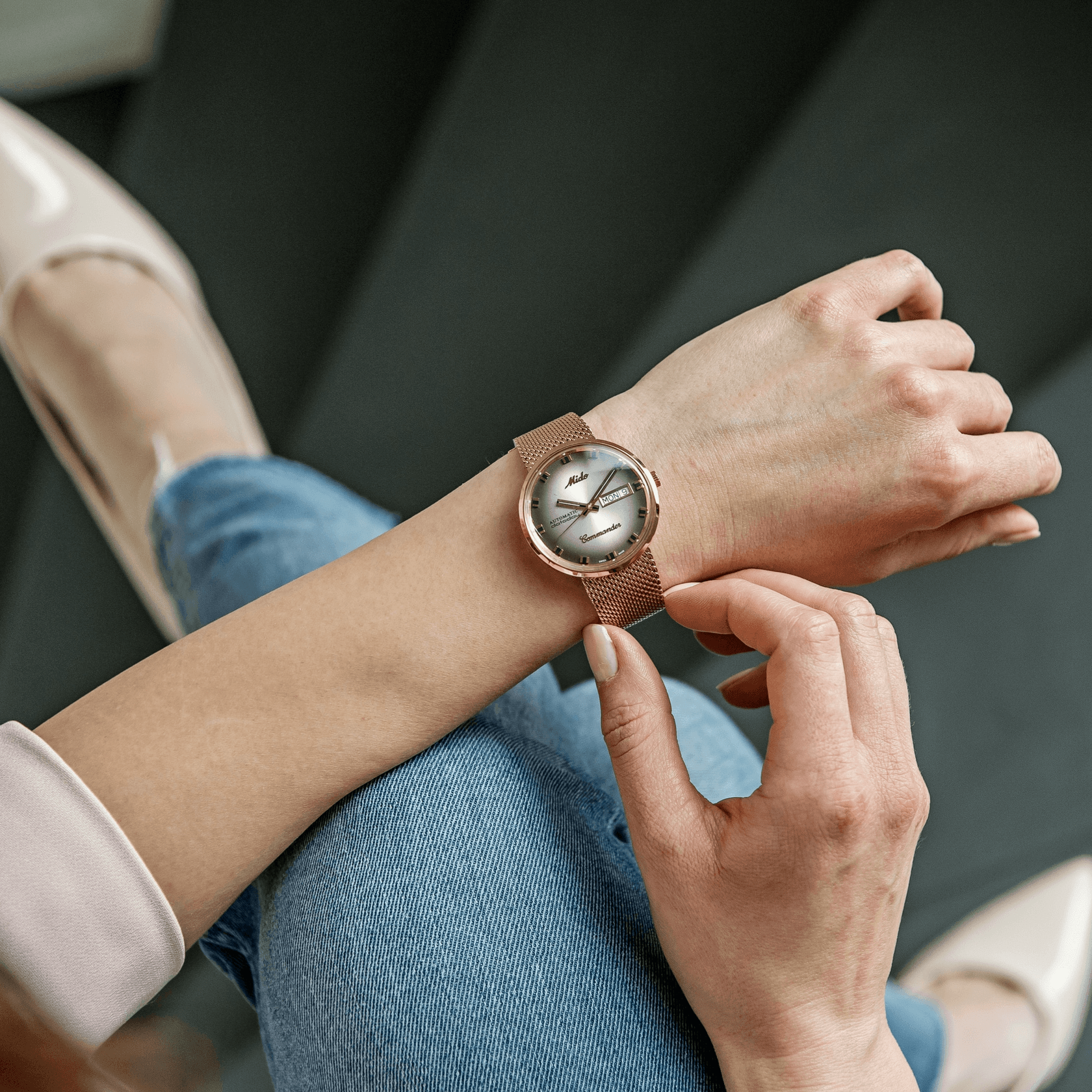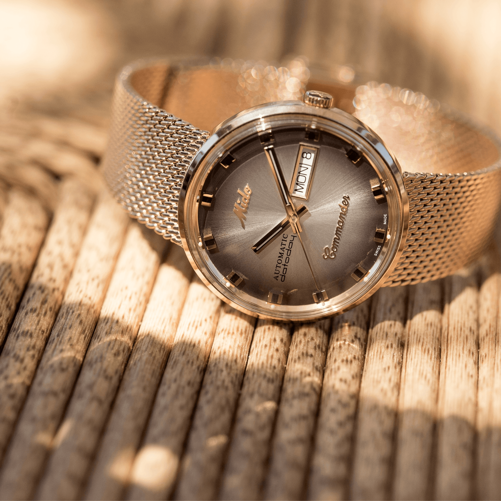 Iconic, bold, and timeless — the Commander Shade collection honours MIDO's rich watchmaking heritage. Its sleek monocoque case, graduated two-tone dial finish with luminous hands, applied indexes, and day-date window reflect a distinct vintage spirit. Paired with a refined Milanese mesh bracelet, each timepiece offers a seamless blend of retro charm and modern elegance. Powered by a reliable automatic movement, Commander Shade is a tribute to legendary design, crafted for those who appreciate enduring style and mechanical artistry.