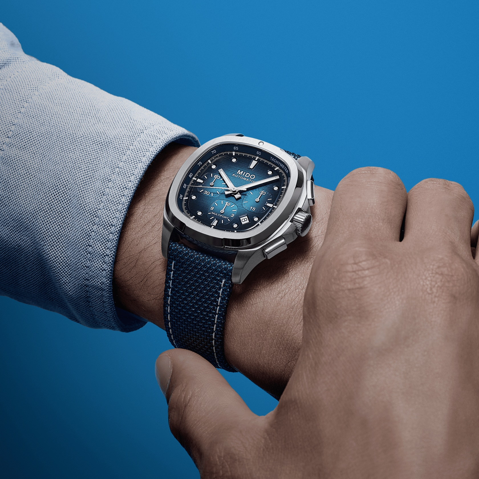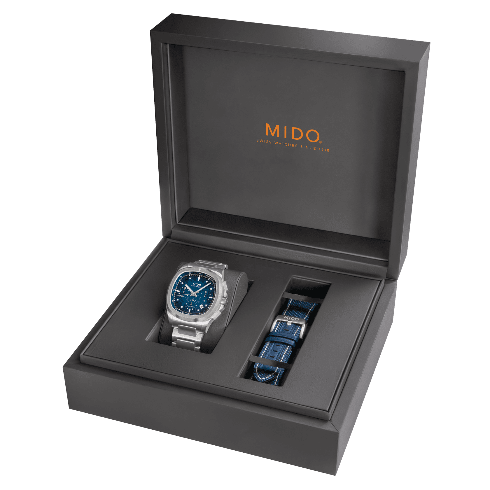 An eye-catching design! True to MIDO’s bold spirit, the Multifort TV Chronograph asserts its character with a uniquely styled TV-shaped case. Its contemporary silhouette is enhanced by a horizontally brushed dial, brought to life by two subtly integrated counters and contrasting details that highlight its personality. At its core ticks the Caliber 60 – a high-precision Swiss automatic movement – delivering up to 60 hours of power reserve. Technical, expressive, and perfectly balanced, this timepiece is built to accompany every standout moment of daily life. It is delivered with an additional strap, offering even greater versatility and comfort.