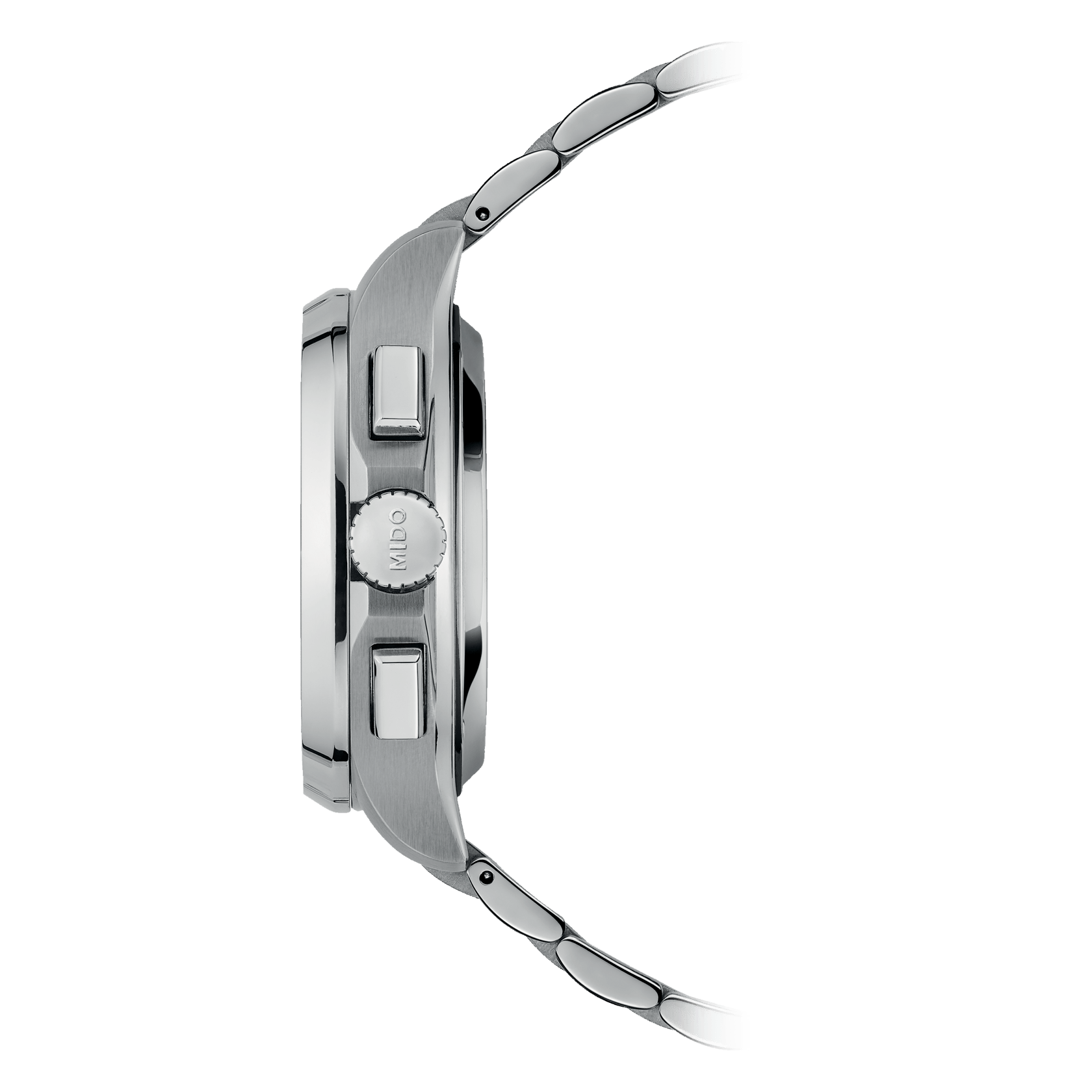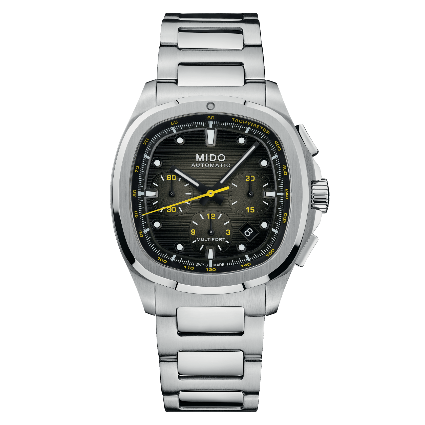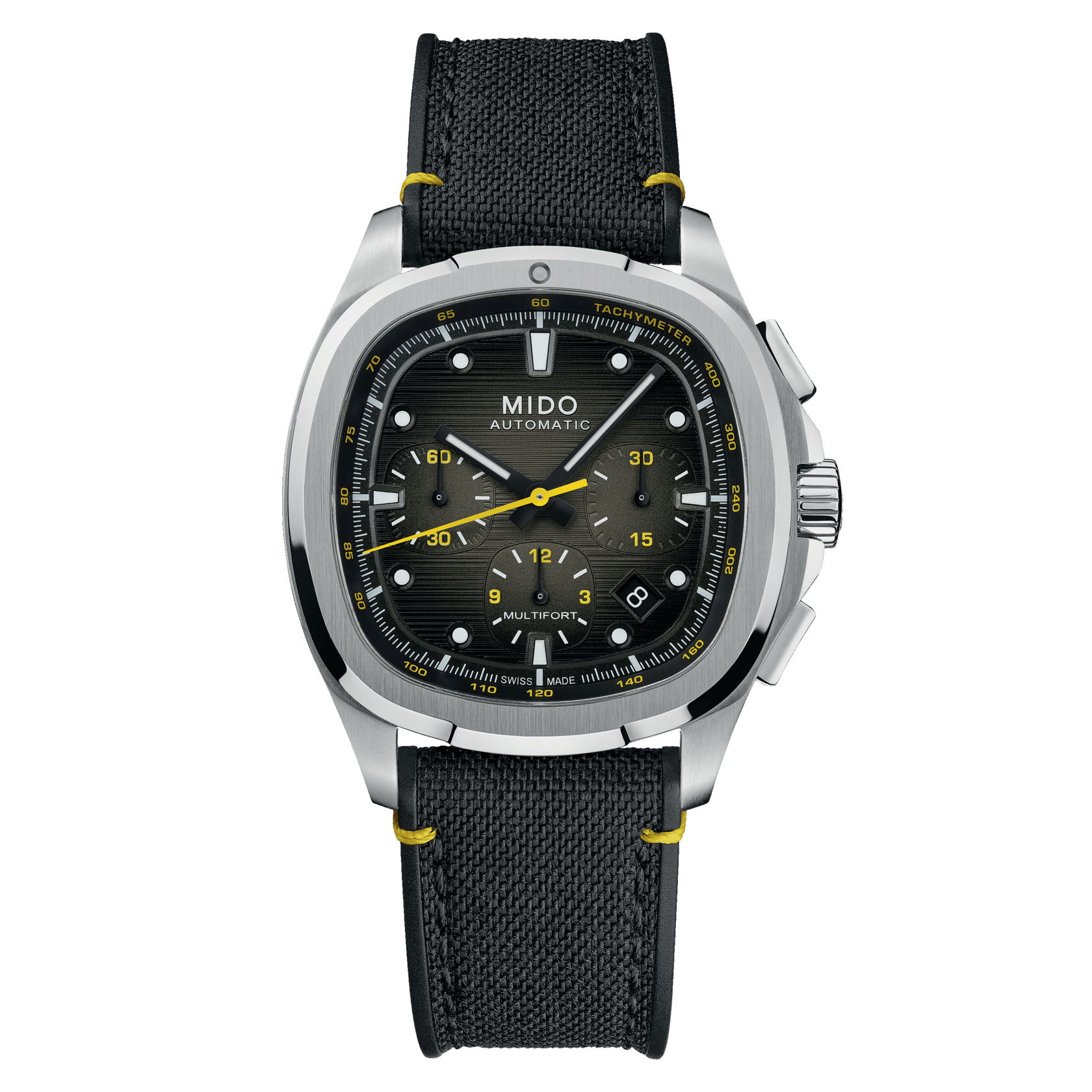 An eye-catching design! True to MIDO’s bold spirit, the Multifort TV Chronograph asserts its character with a uniquely styled TV-shaped case. Its contemporary silhouette is enhanced by a horizontally brushed dial, brought to life by two subtly integrated counters and contrasting details that highlight its personality. At its core ticks the Caliber 60 – a high-precision Swiss automatic movement – delivering up to 60 hours of power reserve. Technical, expressive, and perfectly balanced, this timepiece is built to accompany every standout moment of daily life. It is delivered with an additional strap, offering even greater versatility and comfort.