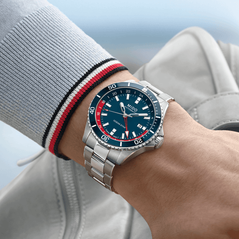 MIDO is enriching its Ocean Star diving watches collection with a version equipped with the highly practical GMT function. It clearly displays the time in two different time zones: home time and local time. On the back of the sporty Swiss watch - fitted with the Caliber 80 automatic movement , which offers a power reserve of up to 80 hours - MIDO has engraved the time-zone indications. The extremely easy-to-use GMT function offers twice as much freedom for those who are either by the ocean or on an adrenalin-fuelled adventure.