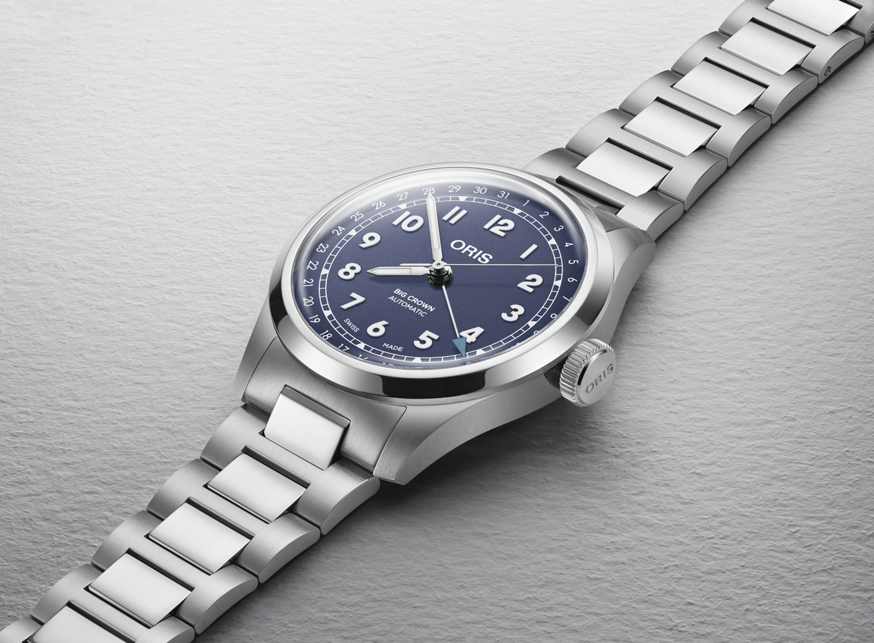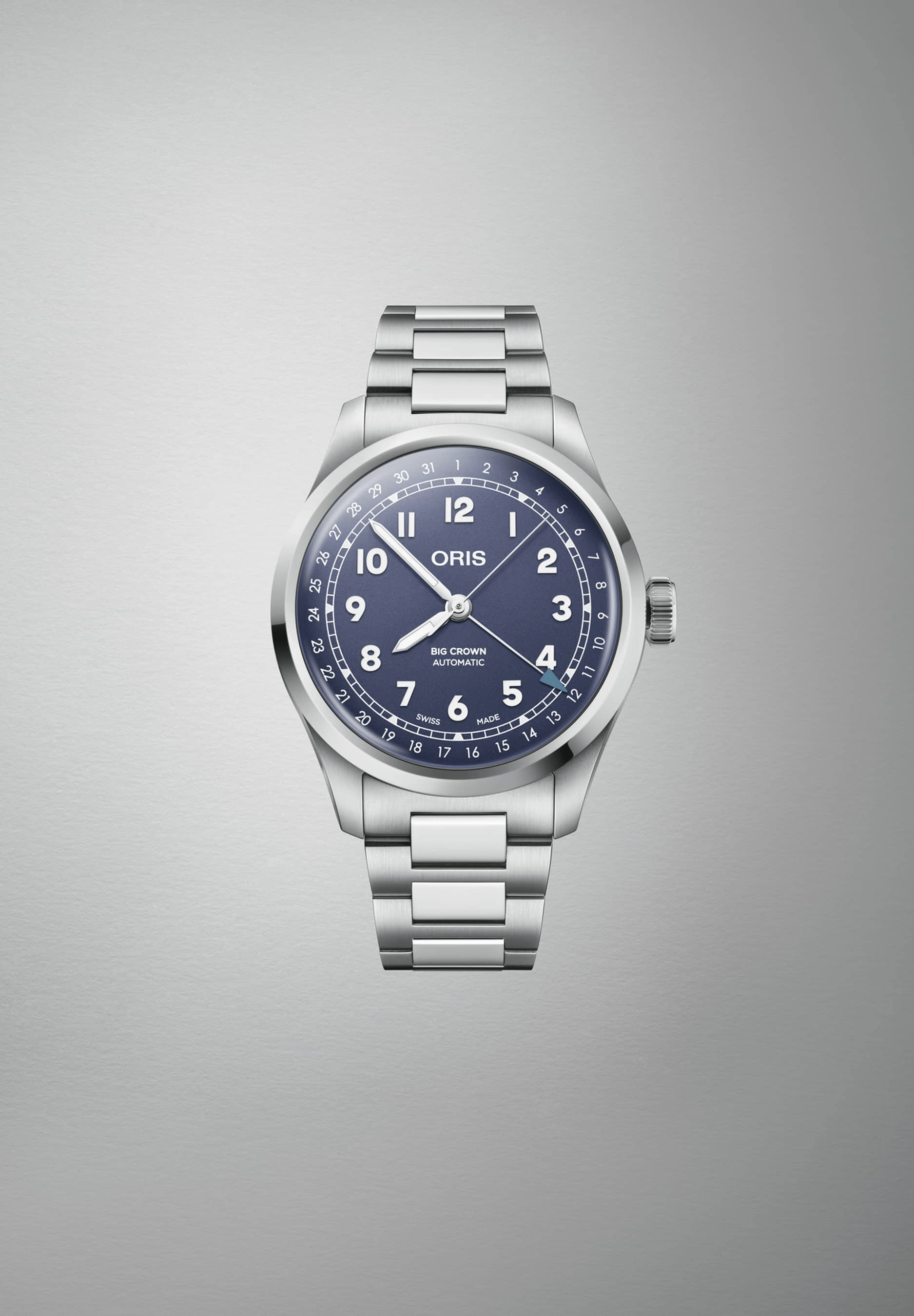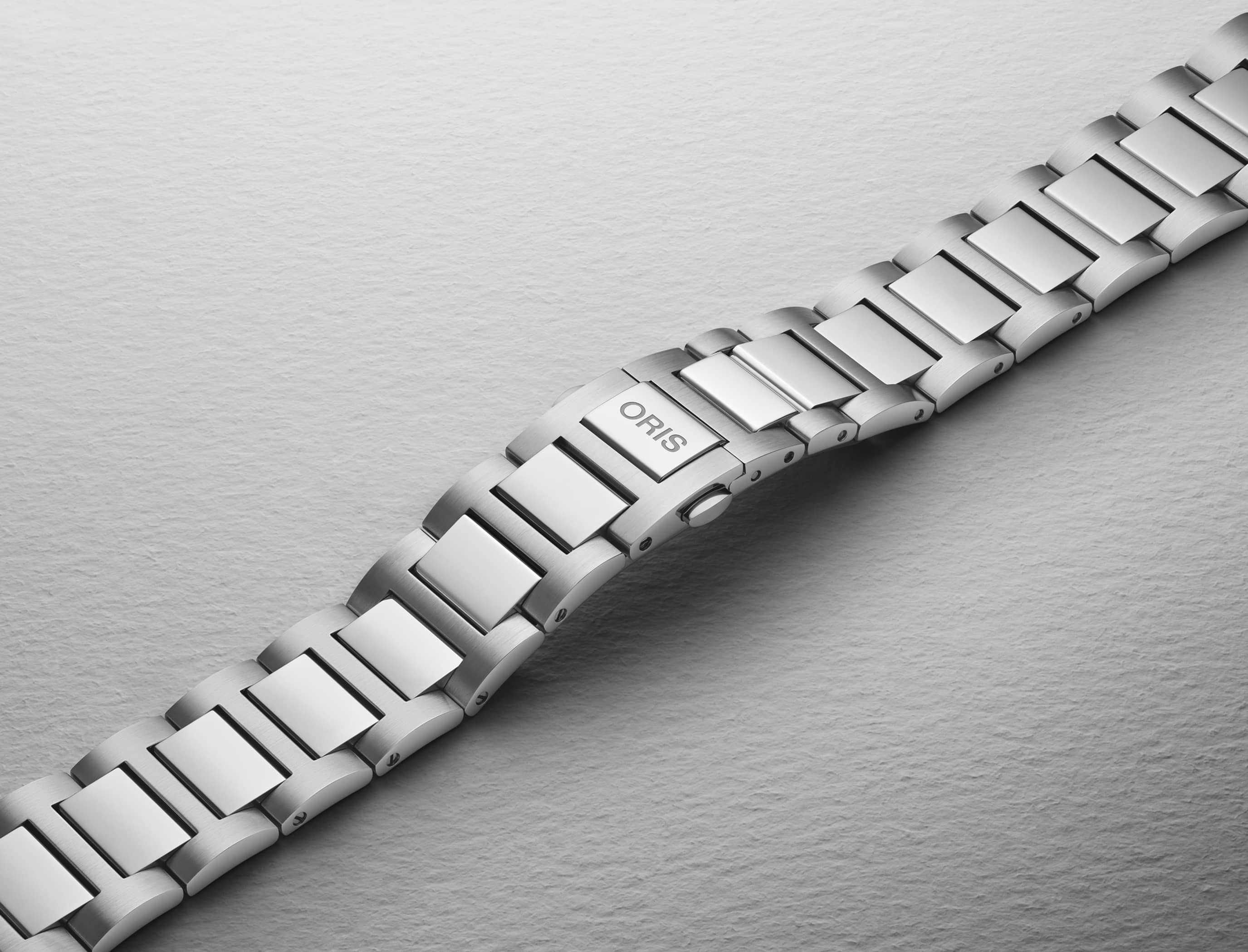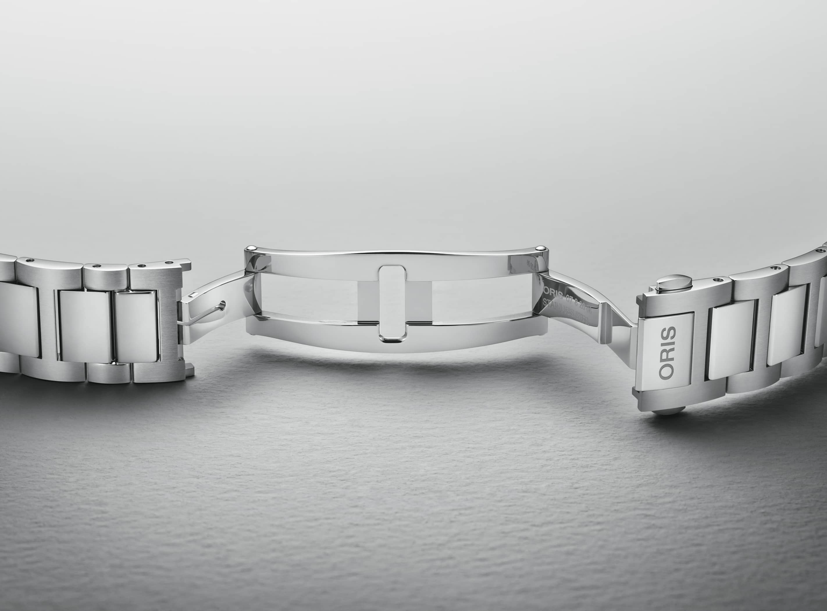 This Big Crown Pointer Date has an elegant, extremely chic lilac dial. Around that is a 40.00 mm stainless steel case set on an H-link bracelet with an Oris-developed clasp that wraps seamlessly around your wrist. Our icon reborn.