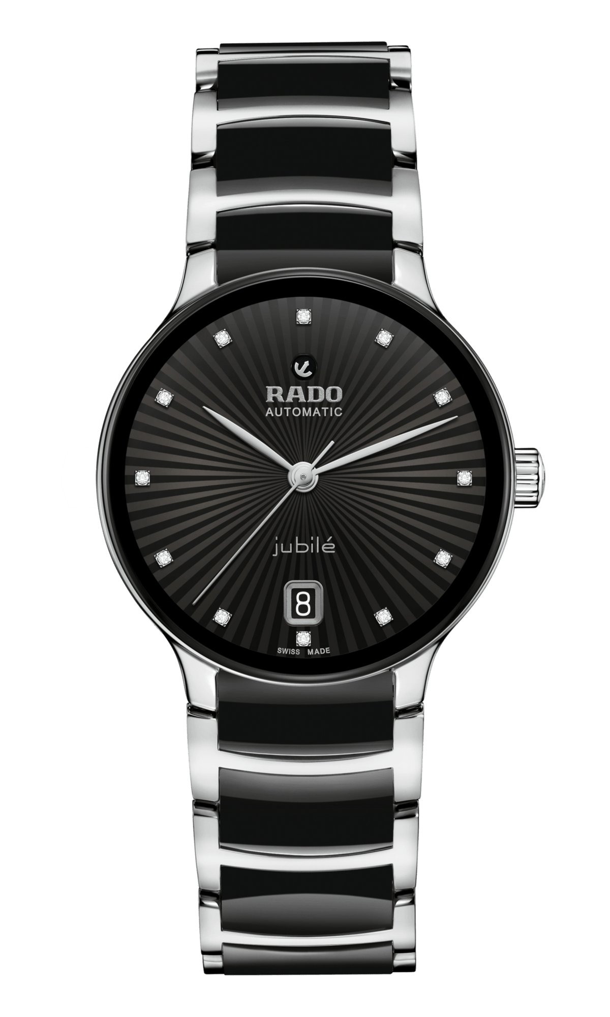 Experience the harmonious blend of visual harmony and artistic expression with the Rado Centrix Automatic Diamonds watch. A gently curved sapphire crystal with a rounded edge, bonded to the case, completes the design and gives perfect readability, thanks to anti-reflective coating on both faces. Inside, the three-hand calibre R763 movement exceeds standard accuracy test requirements from 3 to 5 positions, thanks to its antimagnetic Nivachron™ hairspring for increased reliability and accuracy. The overall appearance of this iconic timepiece is completed with adjusted case lugs and a bracelet made of polished stainless steel with black high-tech ceramic middle links. The black facetted dial with 12 diamonds has an opulent 3D effect created by stamping a shaped dial and then filling it with lacquer. The watch is water resistant down to 50 m and offers 80 hours of power reserve.