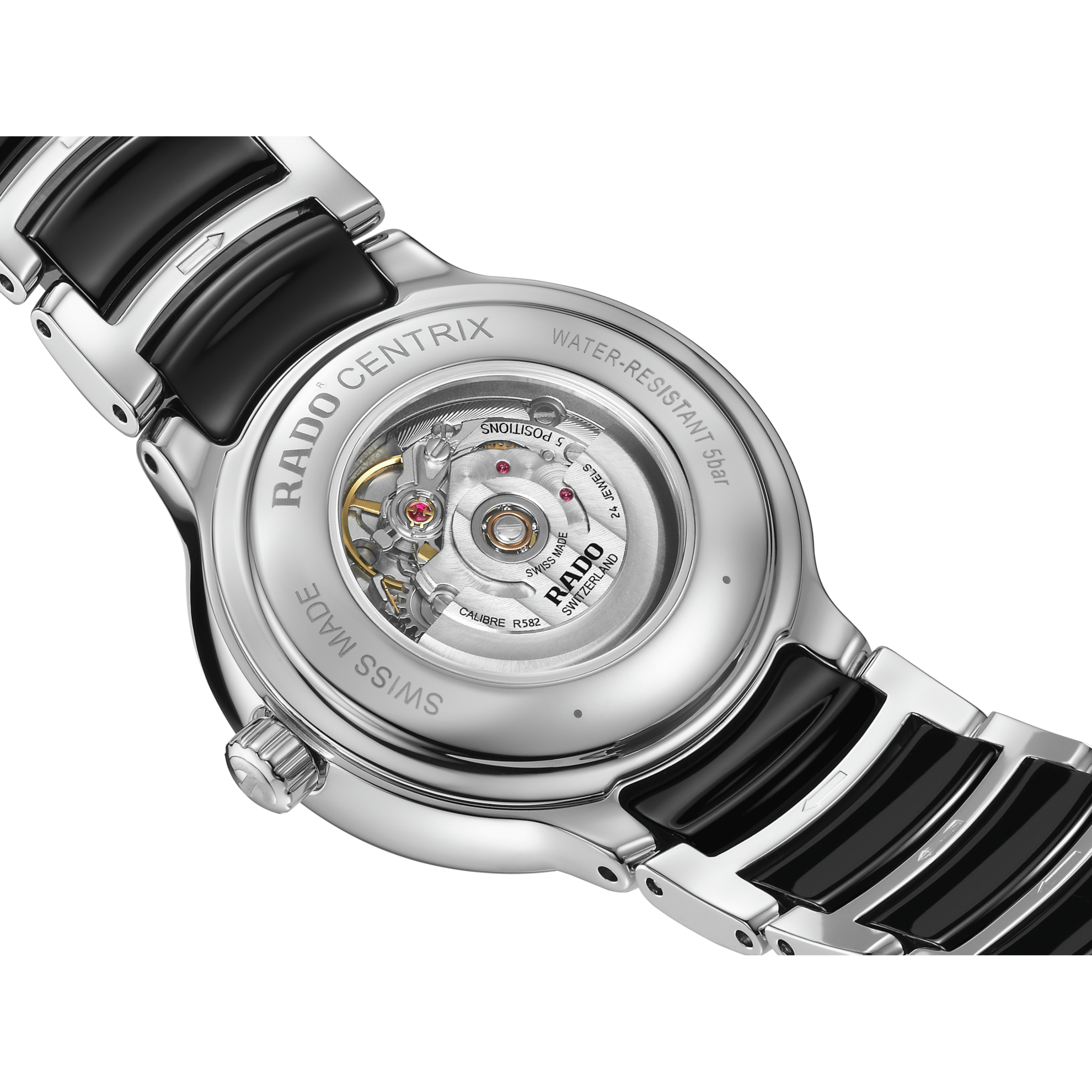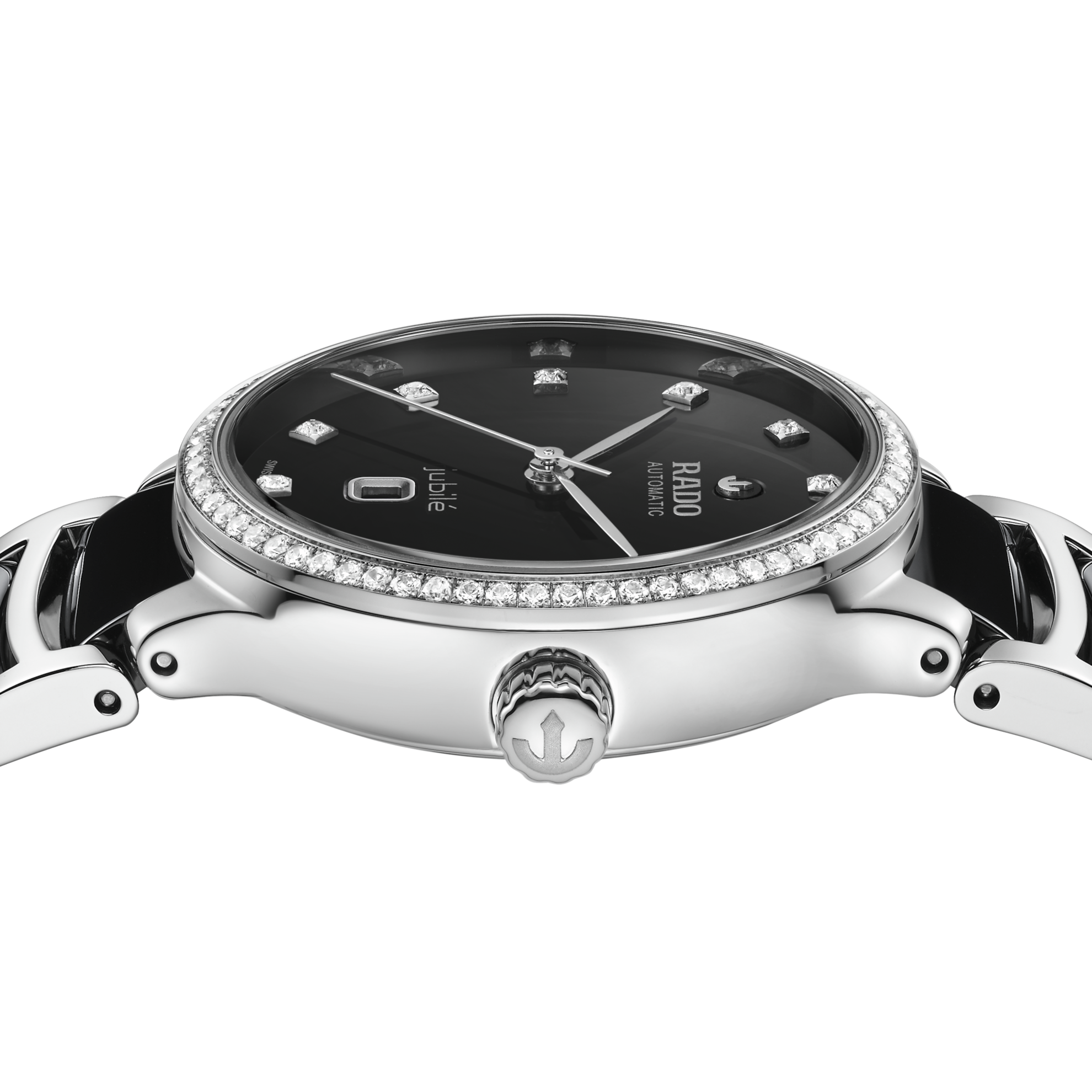 Experience the Centrix Super Jubilé – a blend of artistic expression and refined design. Crafted in stainless steel, the 30.5 mm case is refined with a luxurious bezel set with 68 Top Wesselton, VS-SI, brilliant cut diamonds. In addition, the curved sapphire crystal features an anti-reflective coating on both sides, ensuring unmatched readability. At the heart of this watch beats the R582 automatic calibre, which is visible through the sapphire crystal case back. The movement is equipped with an antimagnetic Nivachron™ hairspring, delivering exceptional accuracy and a 48-hour power reserve. The black lacquered dial is adorned with 12 Top Wesselton, VS-SI, brilliant cut diamond indexes and a date window at 6 o’clock. The neat look is completed with a stainless-steel bracelet with black high-tech ceramic middle links. Finally, the bracelet features a triple-fold stainless steel clasp.