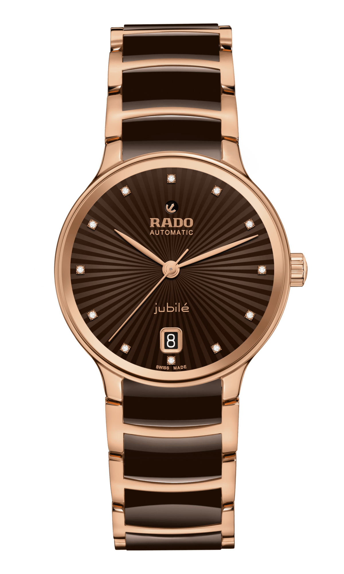The classic Centrix Automatic Diamonds watch has been reworked not only technically, but also aesthetically. The modified model has a rounded sapphire crystal that extends all the way to the edge and a curved case blending with the curved crystal edge. The overall appearance of this iconic timepiece is completed with adjusted case lugs and a bracelet made of polished rose-gold-coloured PVD-coated stainless steel with brown high-tech ceramic middle links. The brown facetted dial has an opulent 3D effect created by stamping a shaped dial and then filling it with lacquer. Inside, the three-hand calibre R763 movement exceeds standard accuracy test requirements from 3 to 5 positions, thanks to its antimagnetic Nivachron™ hairspring for increased reliability and accuracy. The watch is water resistant down to 50 m and offers 80 hours of power reserve.