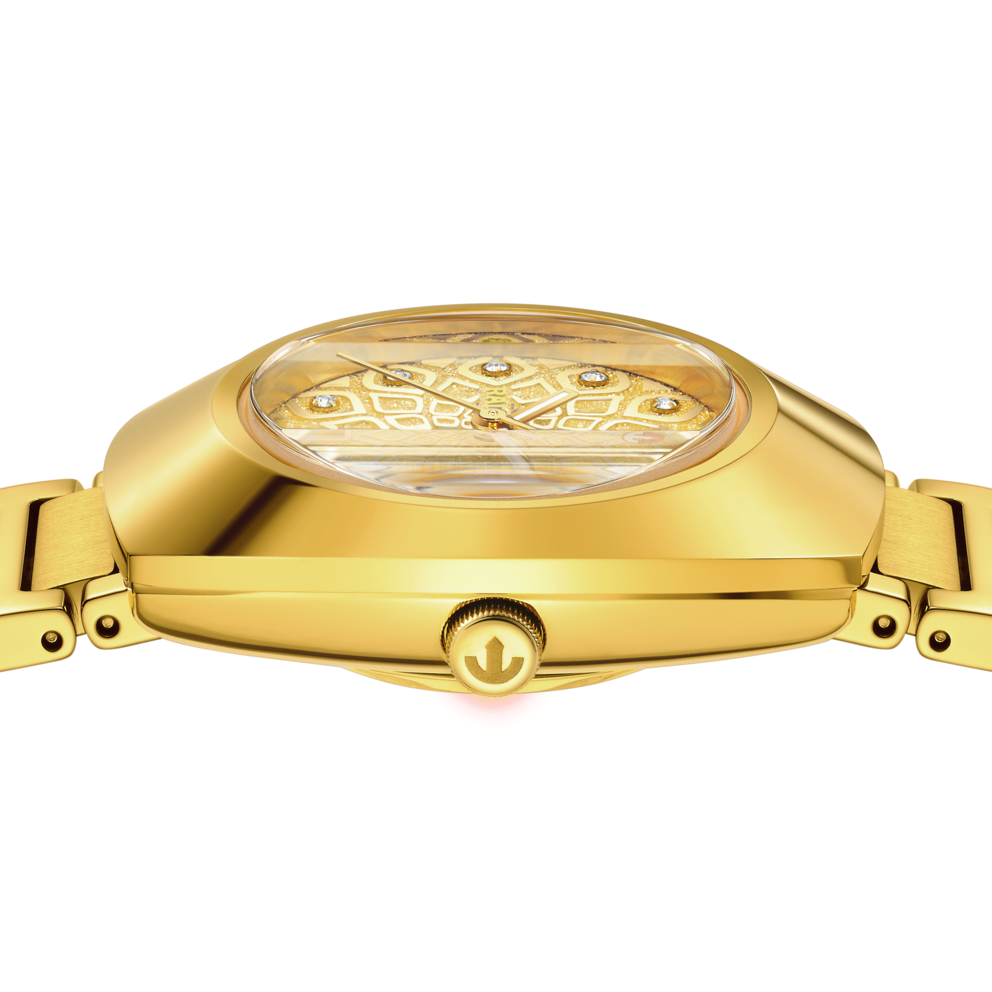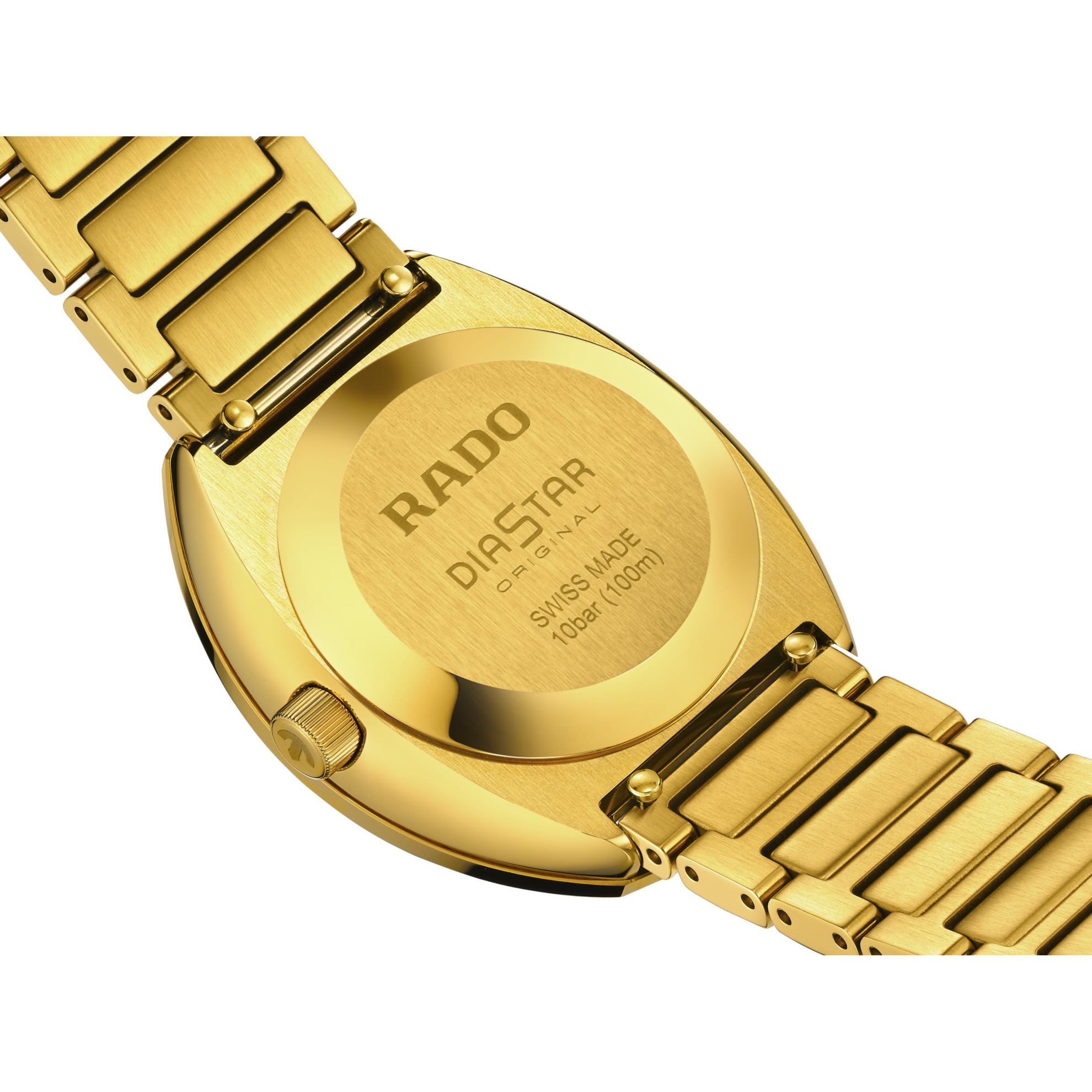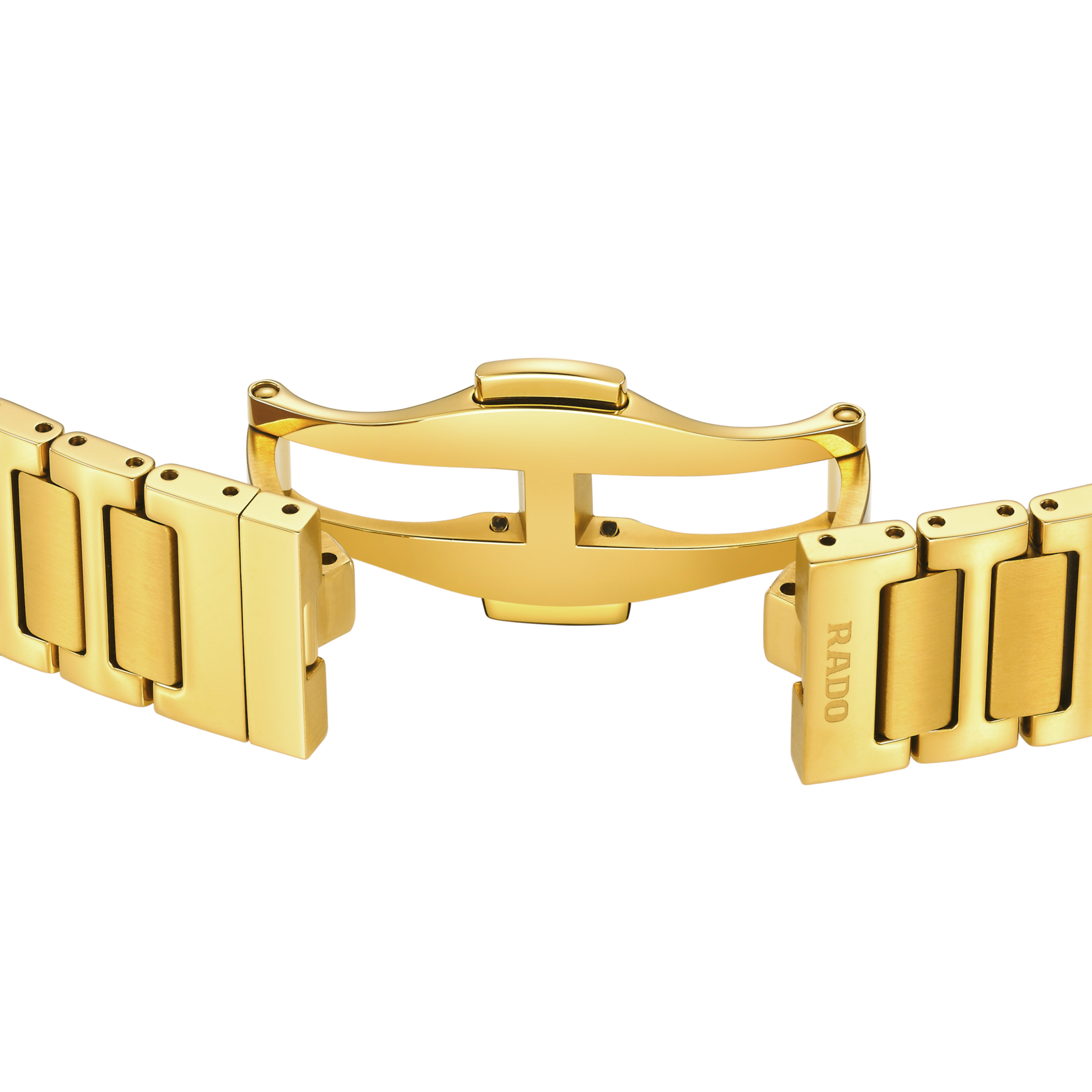 An iconic symbol of Swiss craftsmanship and pioneering innovation. The Rado DiaStar is designed for those who dare to embrace the extraordinary. The 30 mm case, crowned by a polished yellow gold-coloured PVD coated Ceramos™ bezel, merges effortlessly with a polished yellow gold-coloured PVD coated stainless-steel middle case, offering water resistance up to 10 bar (100 metres). The dial features a yellow-coloured harmonic pattern laying against a diamond-powder-like background combined with 11 cubic zirconia set in yellow coloured mount, playing elegantly with light, highlighting the iconic gold-coloured moving anchor and a meticulously positioned date window at 6 o’clock. Yellow gold-coloured hands with white Super-LumiNova® ensure perfect readability at all times. This refined display is safeguarded by vertical faceted sapphire crystal with an anti-reflective coating inside. At its heart lies the automatic R586 calibre. Finely regulated in five positions and featuring a Nivachron™ hairspring, this movement delivers a high level of accuracy and 48-hour power reserve. The overall appearance of this iconic timepiece is completed with a yellow gold coloured PVD coated stainless-steel bracelet, blending polished links and brushed middle links, secured by a polished, yellow gold coloured, PVD coated, stainless steel 3-fold clasp.