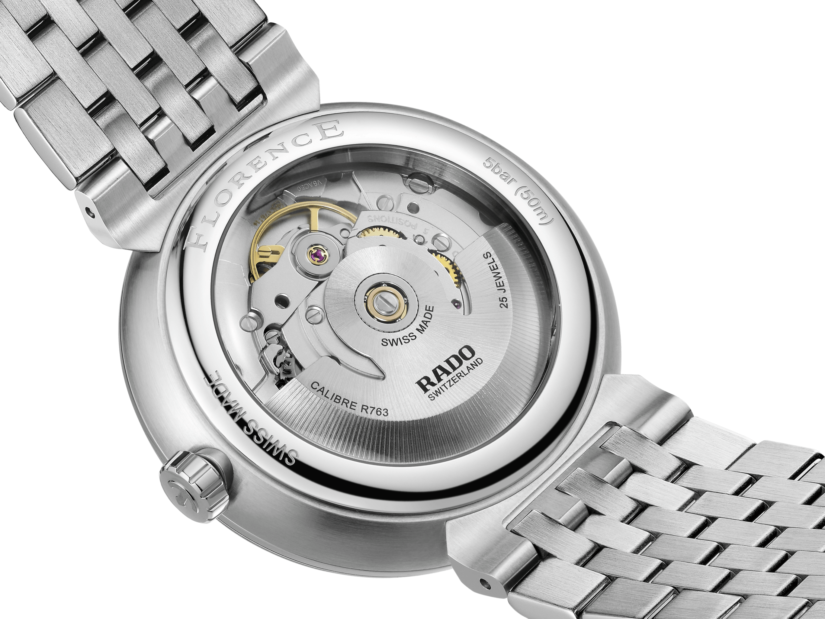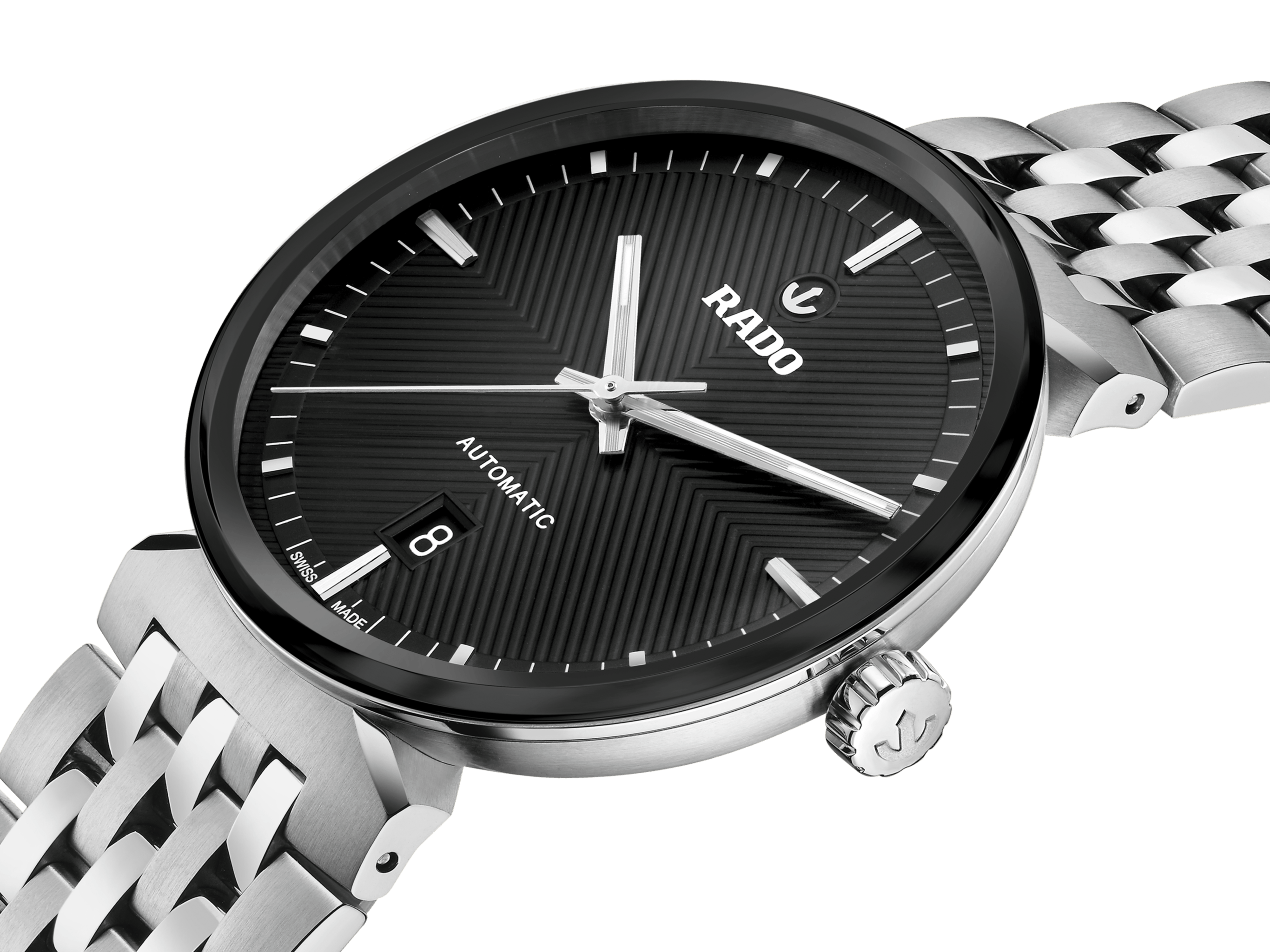 Discover the timeless blend of Swiss precision and elegance with the iconic Rado Florence. The 39 mm case is crowned with an edge-to-edge sapphire crystal, featuring a black metallised edge that matches the dial. This sapphire crystal functions both as the protective front and as a bezel, seamlessly integrated into the case to enhance the Florence iconic refined profile. Serving as a theatre scene, the black dial showcases extreme attention to detail with its sophisticated embossed pattern. The contrasting rhodium coloured applied hour markers, topped by the moving Rado anchor symbol, finished with brushing and polishing, create a hypnotising contrast against the black background. The case is complemented by a stainless steel bracelet, featuring brushed and polished links, and is secured with a stainless steel three-fold clasp. Beneath the box-shaped sapphire crystal case back lies the soul of the Florence: the Automatic R763 calibre. Finely regulated in five positions and featuring a Nivachron™ hairspring, this movement delivers a high level of accuracy and a robust 80-hour power reserve, underlining Rado's commitment to perfection.