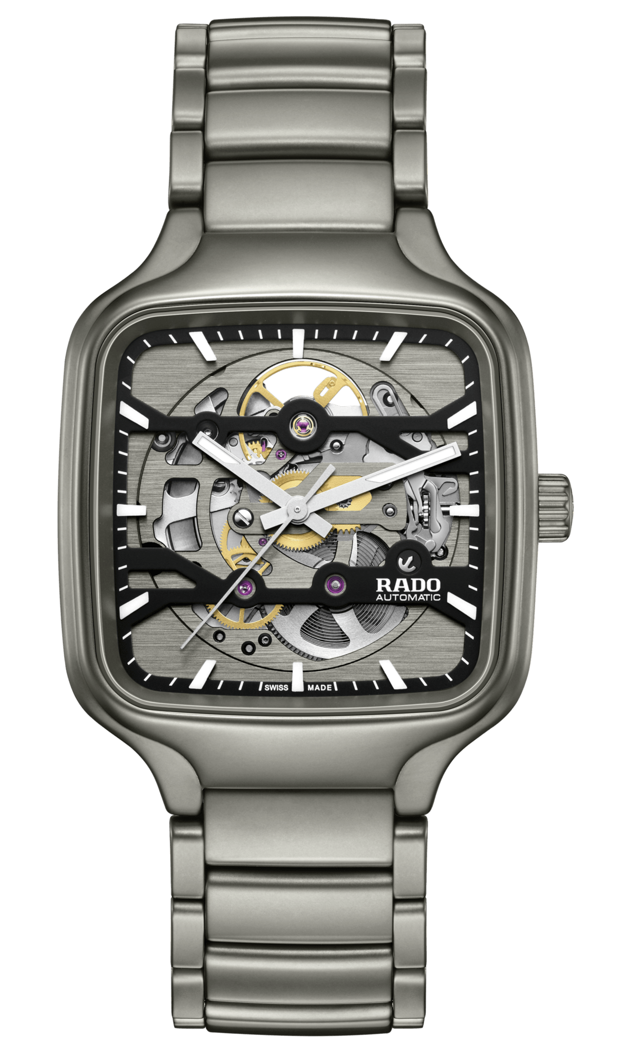 The Rado True Square Skeleton unites complex high-tech materials and ultra fine craftsmanship. Housed in a 38 mm matte plasma high-tech ceramic monobloc case, the R808 skeleton movement is equipped with 25 jewels and offers an 80-hour power reserve. Rigorously tested in five positions, it features an antimagnetic Nivachron™ hairspring and horizontal brushed decorations on the dial side, making this movement a pure demonstration of the Swiss legacy in high-precision engineering. Crowned by a flat sapphire crystal, the dial is a symphony of layered craftsmanship. The black sandblasted skeletonised top plate hovers above the lower plate. On this top layer, white SuperLumiNova® indexes and meticulously printed white minute markers are precisely positioned, providing sharp legibility against the dark background. Beneath, the lower plate reveals refined horizontal brushed decoration in perfect harmony with the movement. At 4 o’clock, the iconic rotating rhodium-coloured anchor completes this dynamic and multi-dimensional display. Completing the case design is a plasma black high-tech ceramic bracelet, which flows seamlessly into a titanium 3-fold clasp, delivering the exceptional wearing comfort that high-tech ceramic provides.