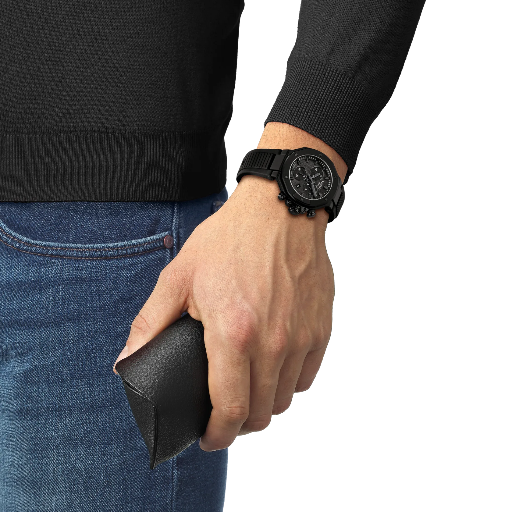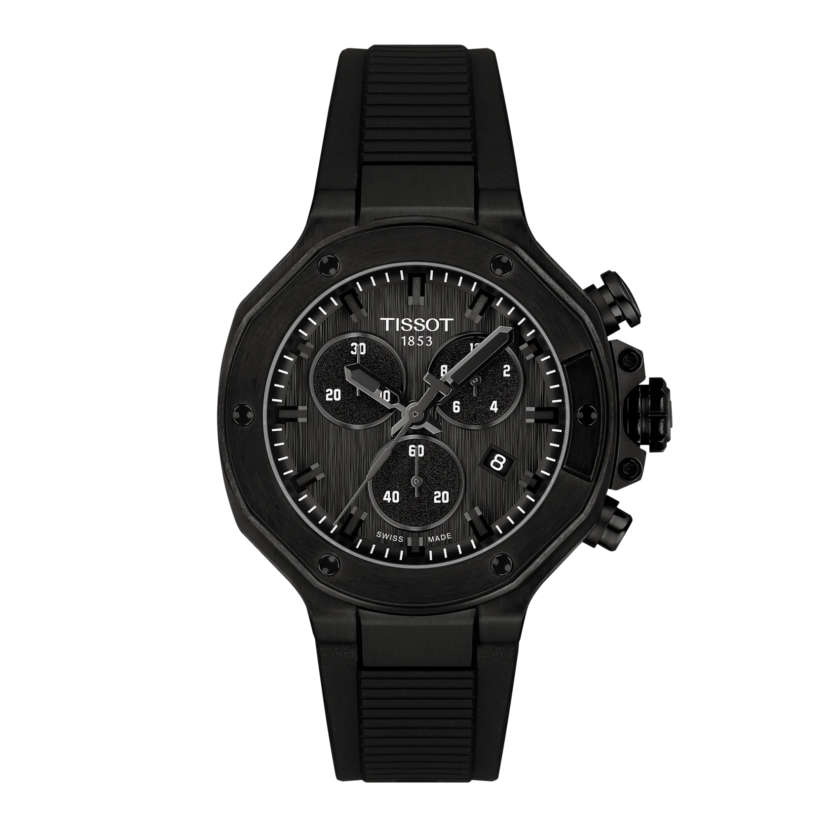 Tissot has drawn inspiration from its partnership with motorcycle racing to create a watch that reflects the dynamism of motorcycles and the emotion of the sport... The T-Race collection immerses the wearer in a mechanical environment and awakens the spirit. The bezel resembles a brake disc, the pushers are inspired by handlebars, and the cooling fins of an engine are reproduced on the side of the case. The watch is water-resistant to 10 bar (100 m) and equipped with a quartz chronograph movement.