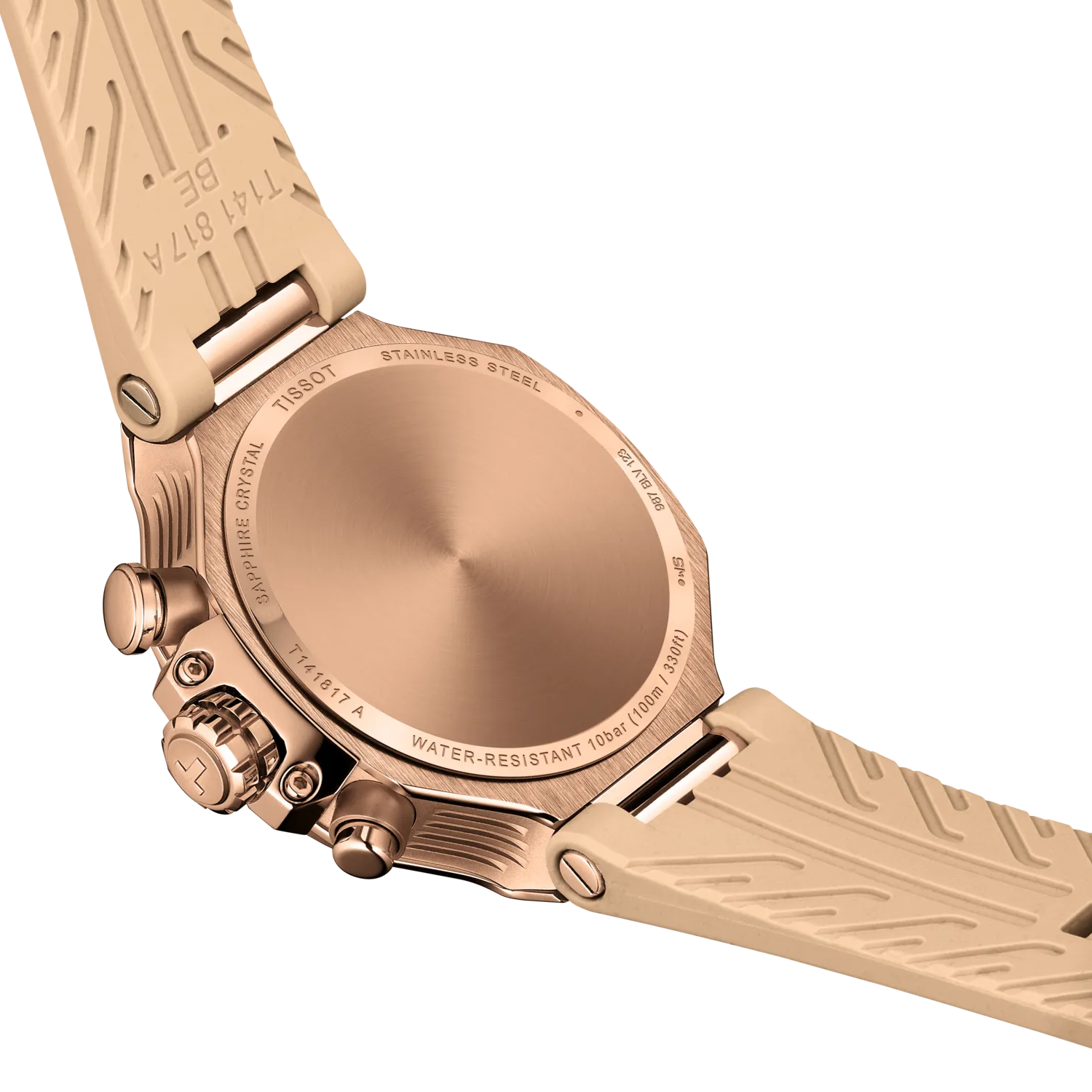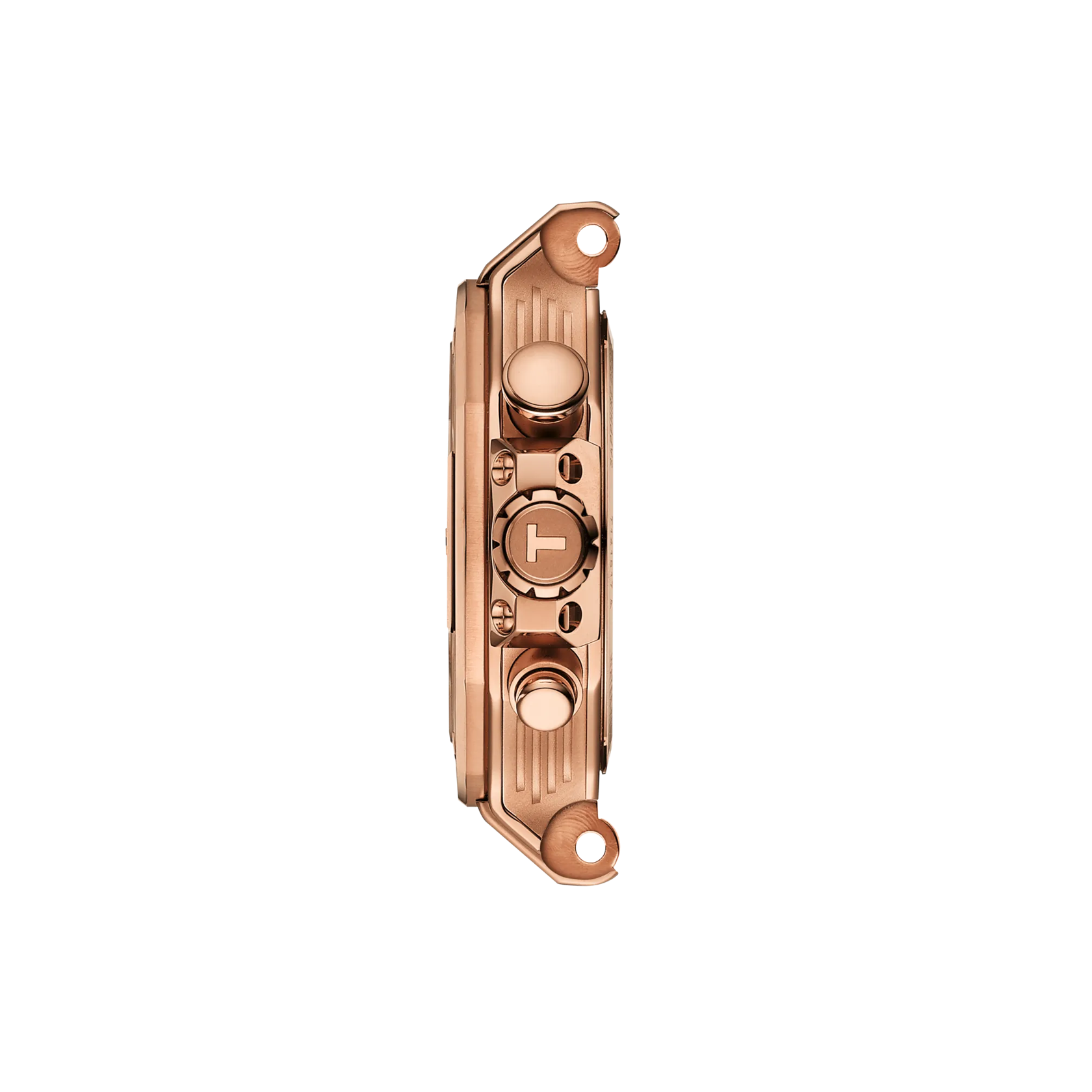 Tissot has drawn inspiration from its partnership with motorcycle racing to create a watch that reflects the dynamism of motorcycles and the emotion of the sport... The T-Race collection immerses the wearer in a mechanical environment and awakens the spirit. The bezel resembles a brake disc, the pushers are inspired by handlebars, and the cooling fins of an engine are reproduced on the side of the case. The watch is water-resistant to 10 bar (100 m) and equipped with a quartz chronograph movement.