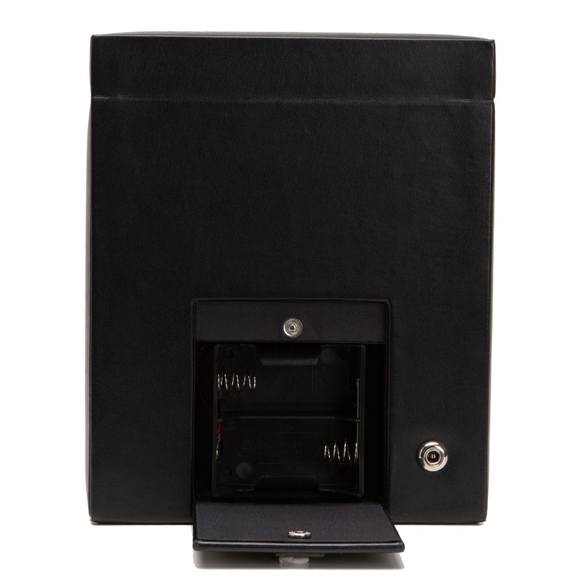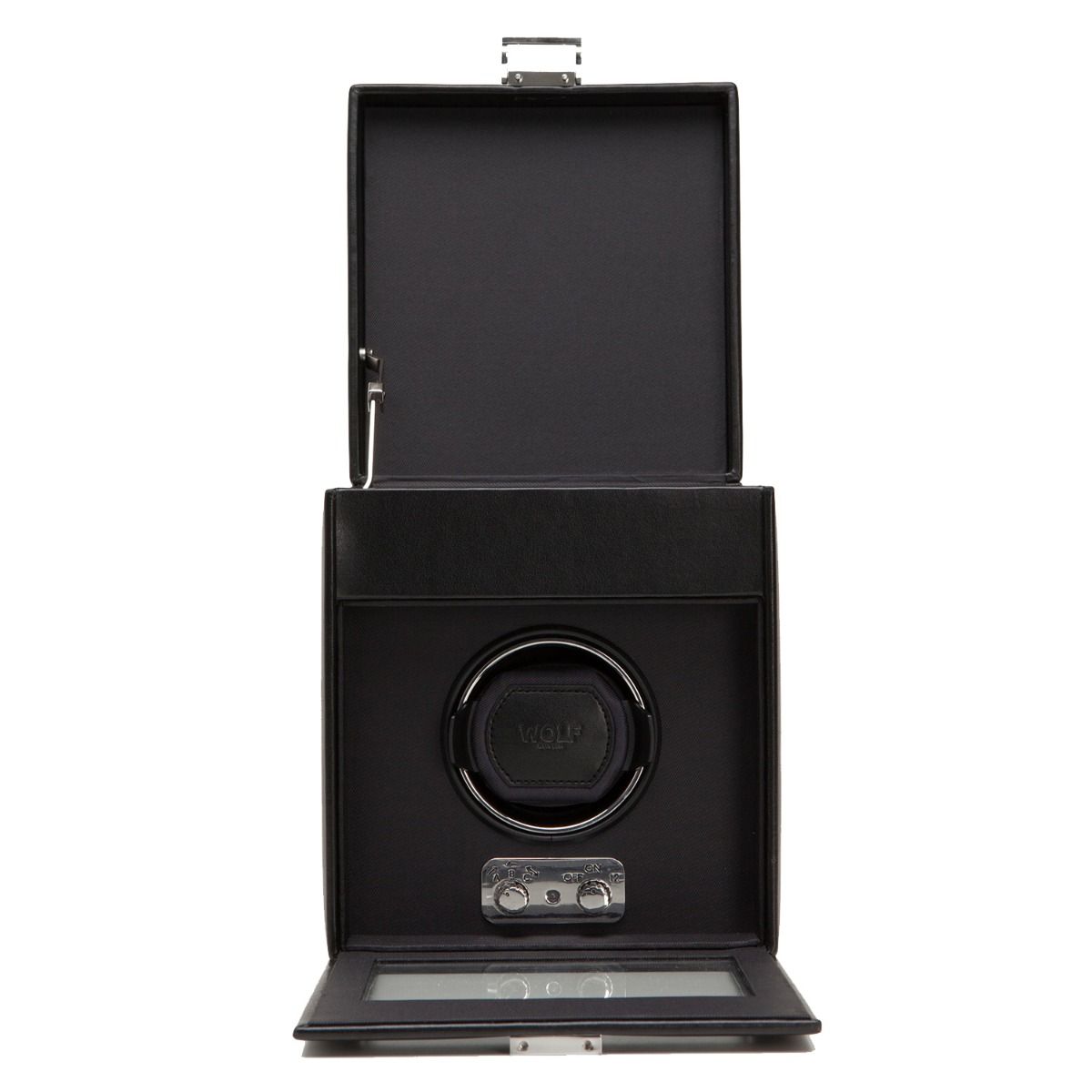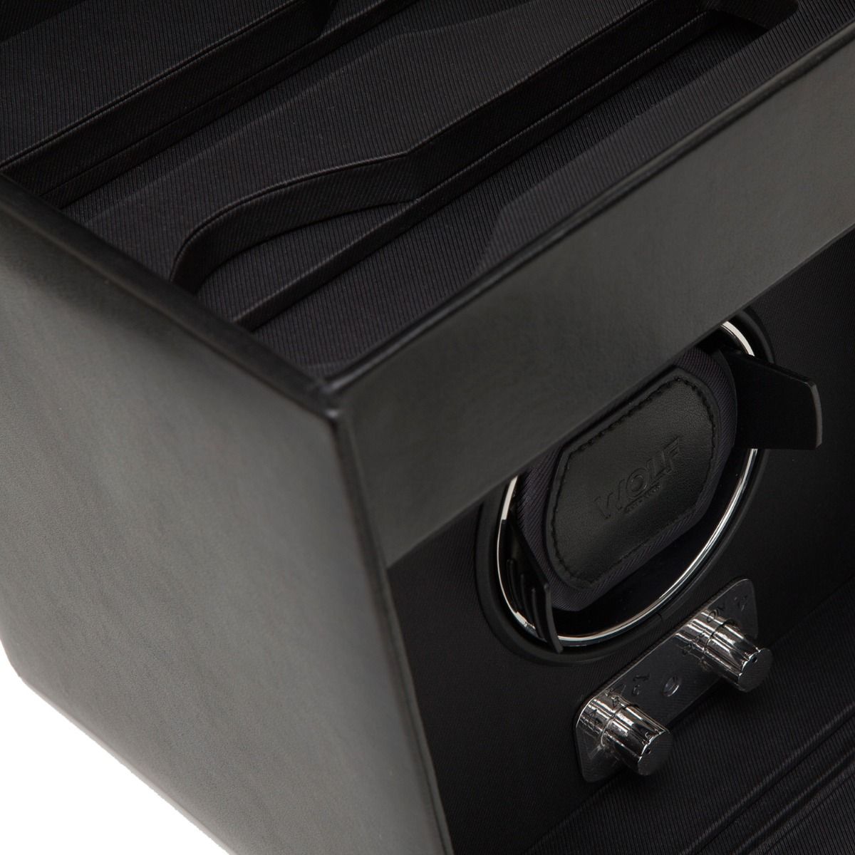A modern watch winder of its kind, sophistication and sharpness have combined in a winder that is both fashionable and functional. Multi-purpose, this watch winder not only maintains the mechanism in automatic timepieces, it also stores quartz watches in style. Includes one winding module, latch closure, glass cover, a black exterior, additional storage, and most importantly, the patented technology that WOLF is best known for.