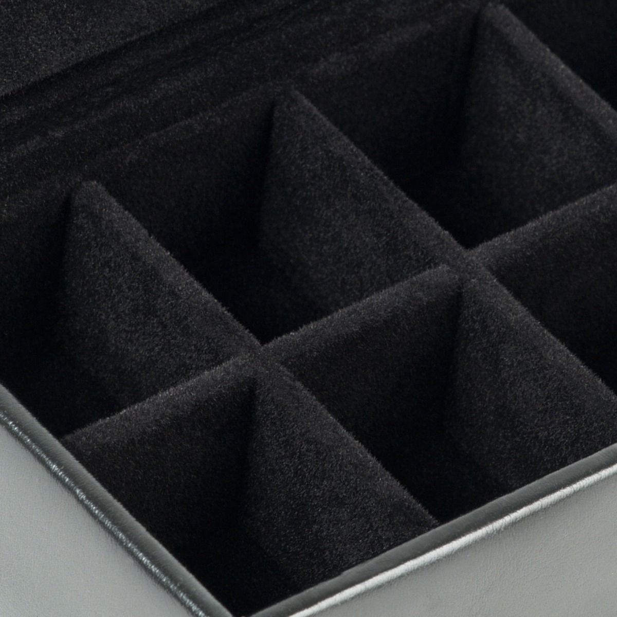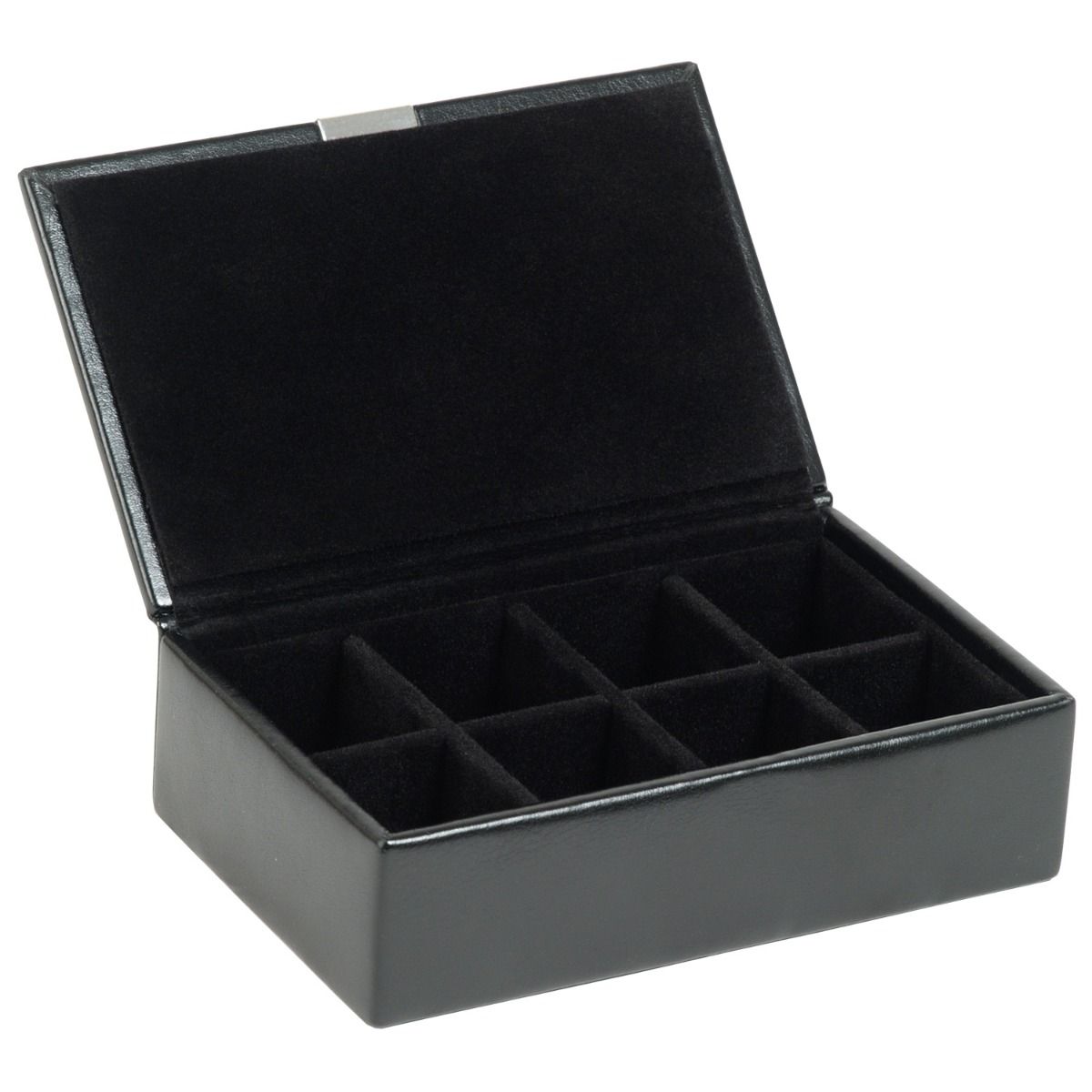 The Heritage Men's collection offers functional, classically designed pieces for your everyday use. This case includes 8 compartments, magnetic closure, chrome finished hardware, black smooth faux leather and ultra suede lining.