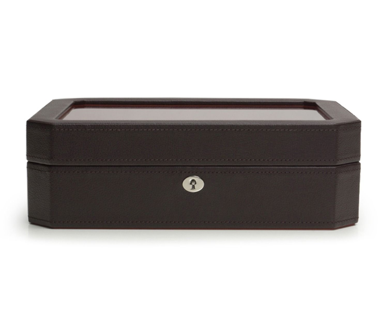 Retro shapes and colors make Windsor a perfect companion for your timepieces. Display and organize your collection beautifully with the Windsor 10-piece watch box. Features chrome finished hardware, locking glass cover, smooth vegan leather, lining and 10-piece watch storage.
