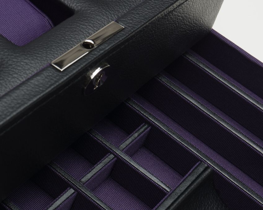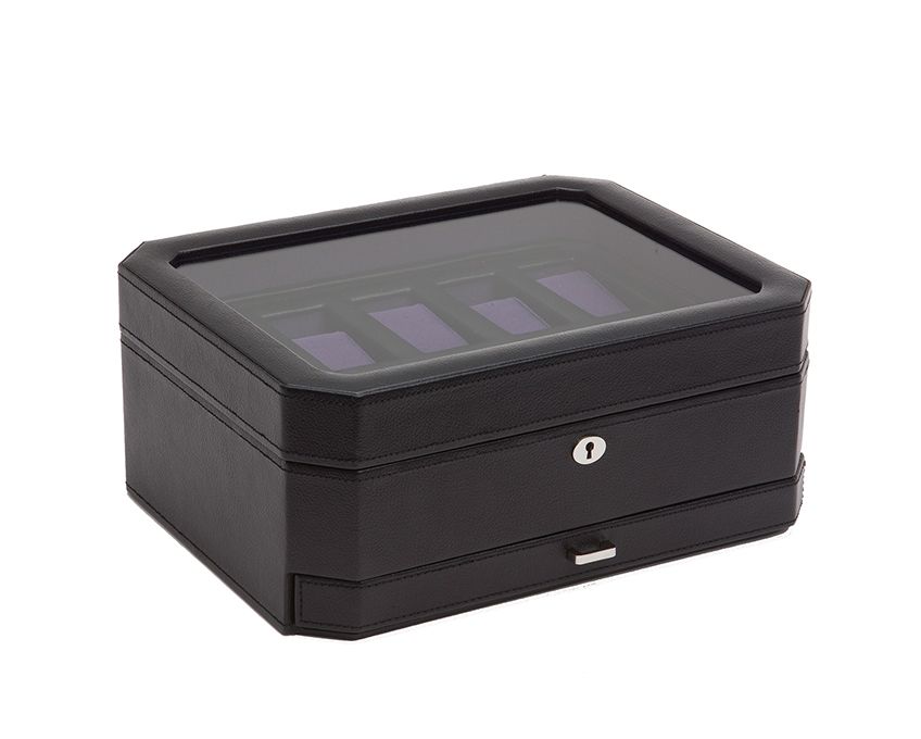 Retro shapes and colors make Windsor a perfect companion for your timepieces. Display and organize your watch collection and accessories beautifully with the Windsor 10-piece watch box with storage. Features chrome finished hardware, locking glass cover, smooth vegan leather, lining, 10-piece watch storage and jewelry storage.