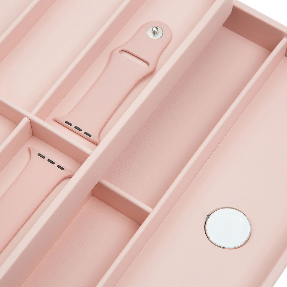 Our smart storage solutions for Apple Watches and smart watches deliver high-tech performance along with quality craftsmanship. The rose quartz Watch Valet w/ Strap Tray for Apple Watches feature 10 compartments for Apple watch straps, charge port, and a docking station for cable and charging puck. Everything you need in one cohesive place. Magnetic charging cable not included.