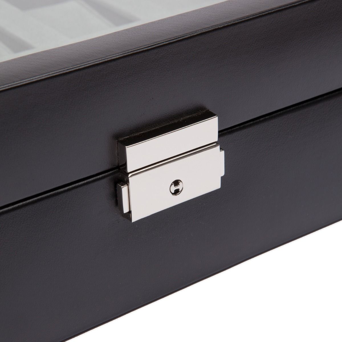 The Heritage Men's collection offers functional, classically designed pieces for your everyday use. This case includes 10 watch compartments, key & lock, glass cover, chrome finished hardware, black smooth faux leather and ultra suede lining.