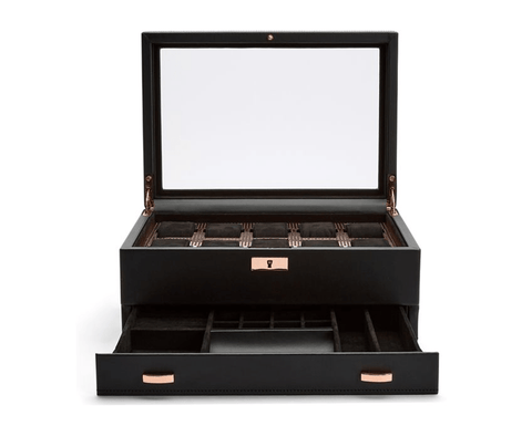 Keep your timepieces safe and secure in style with this Axis 10 Piece Watch Box with Storage. Made from vegan leather, this watch box can beautifully display up to 10 timepieces. Featuring lock and key security, suspended watch cushions and a smart watch USB port.