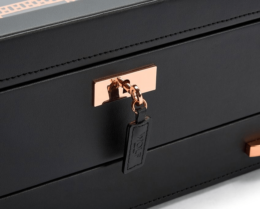Powder-coated and copper-plated laser cut perforated steel melded with clean, sleek lines. The Axis collection drives a modern, bold look for safekeeping your timepieces.