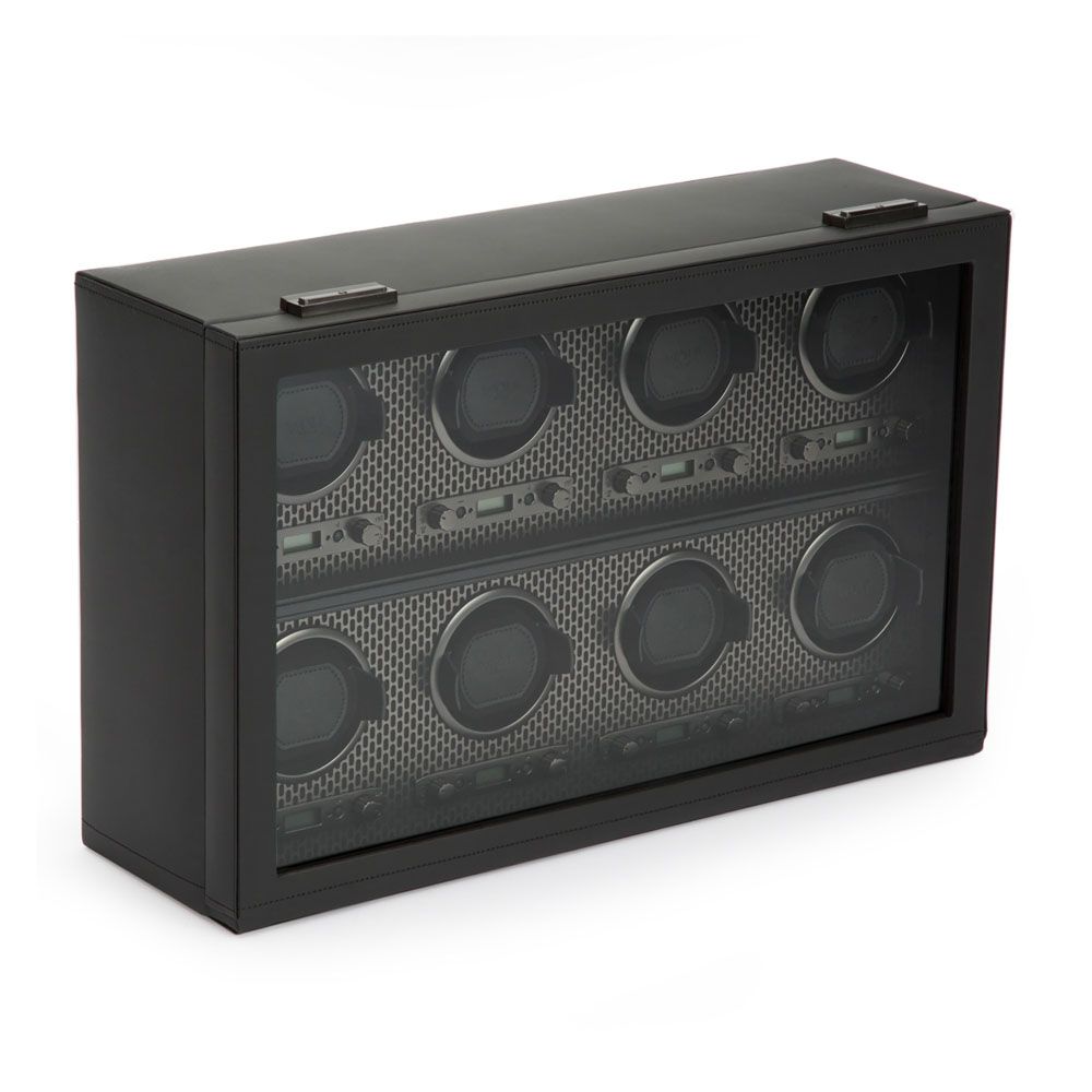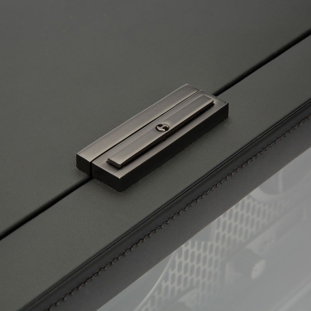 Powder-coated laser cut perforated steel melded with clean, sleek lines. AXIS drives a modern, bold look for safekeeping your timepieces. Trusted patented technology of counting rotations of the axis of your watch guarantees precise turns per day. Bold luxury, faultless design, take AXIS for a spin. Features microsuede interior, locking glass cover, backlit LCD display, matte chrome finished hardware and 8 winding modules.