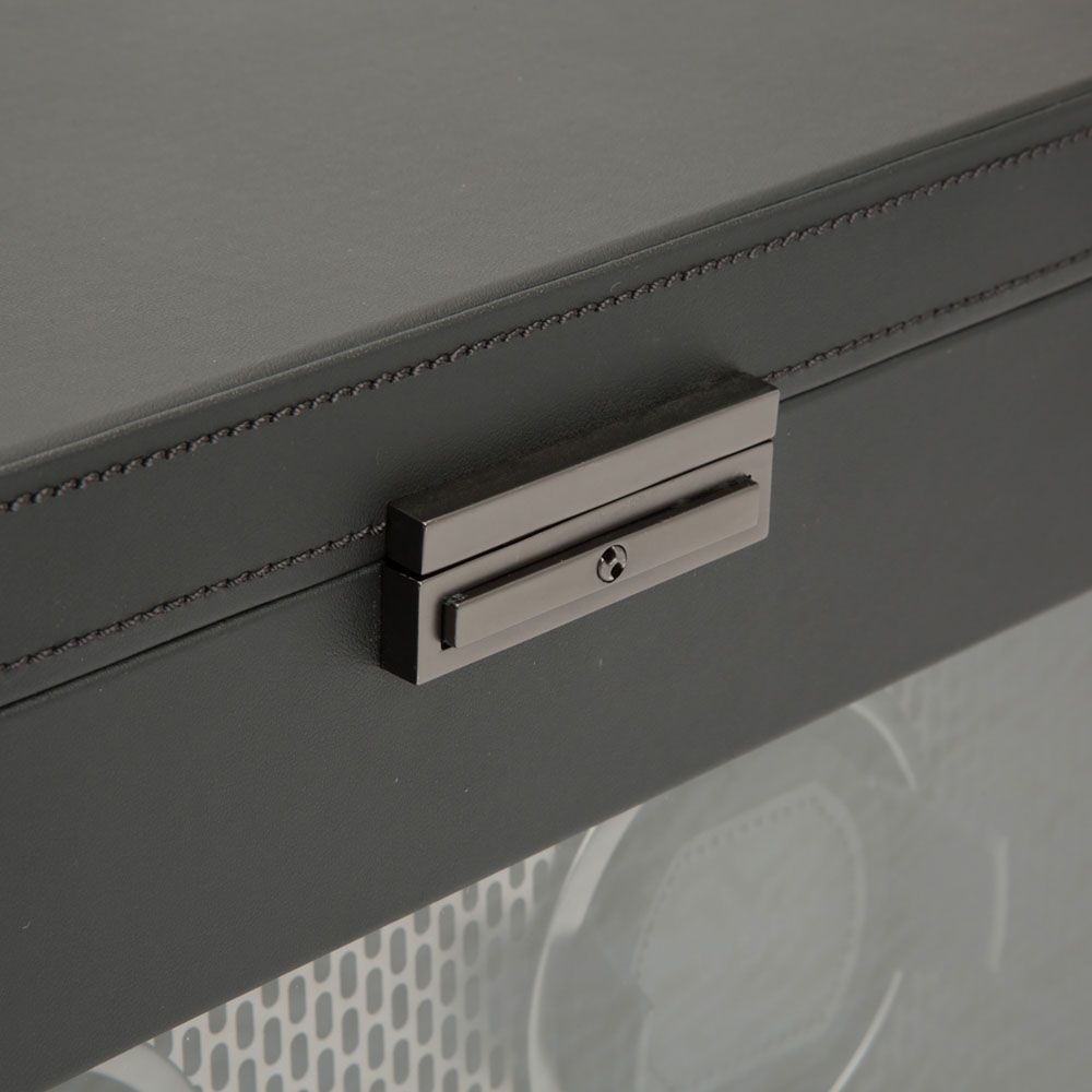 Powder-coated laser cut perforated steel melded with clean, sleek lines. AXIS drives a modern, bold look for safekeeping your timepieces. Trusted patented technology of counting rotations of the axis of your watch guarantees precise turns per day. Bold luxury, faultless design, take AXIS for a spin. Features locking glass cover, backlit LCD display, matte chrome finished hardware and 2 winding modules with storage.