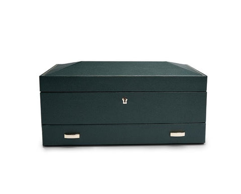 Handmade throughout, British Racing melds the green international motor racing colour of the UK’s cars raced in Ireland in the early 1900’s with a revolutionary quad angled panelled lid. Fine work detailing includes hand-pressed gold foil lines on vegan friendly pebble-grained leather. Gold hardware accents throughout with cushion close hinges. Another design first from WOLF. Protect your watches in style in our 10 piece watch box with storage.