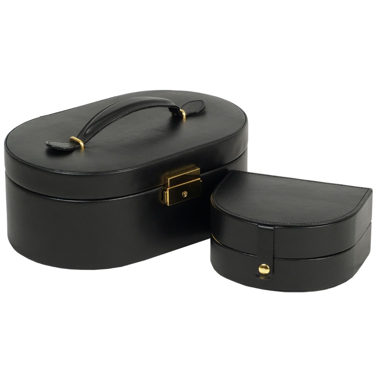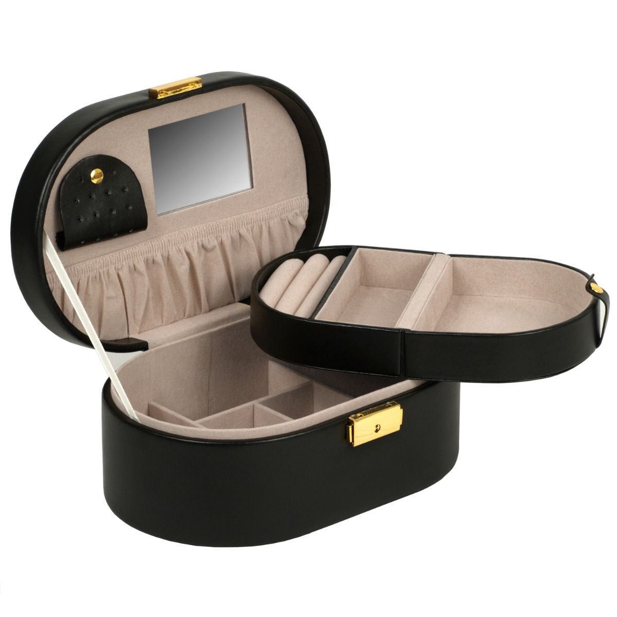 Heritage jewelry case, a classic style combined with functional design. Includes lock & key, 8 jewelry compartments, 14 earring holes, travel case (2 jewelry compartments and 2 ring rolls), glass mirror, chrome finished hardware, vegan leather and ultra-suede lining.