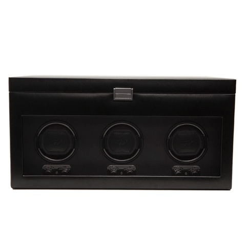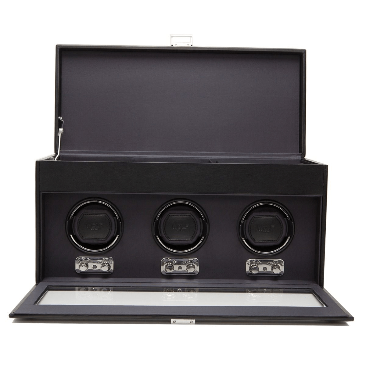 A modern watch winder of its kind, sophistication and sharpness have combined in a winder that is both fashionable and functional. Multi-purpose, this watch winder not only maintains the mechanism in automatic timepieces, it also stores quartz watches in style. This new winder includes brushed metal, three winding modules, latch closure, glass cover, a black exterior, additional storage, and most importantly, the patented technology that WOLF is best known for.